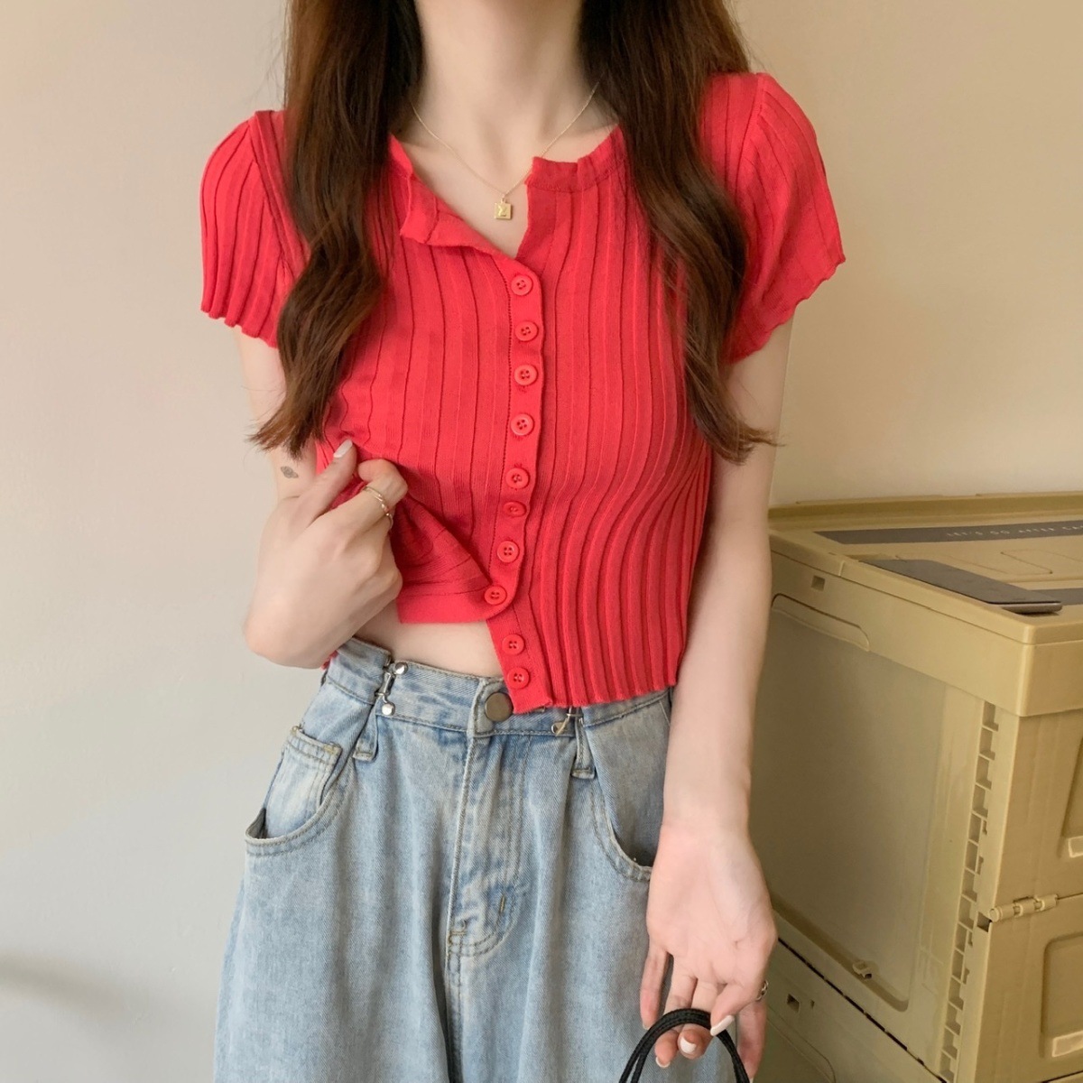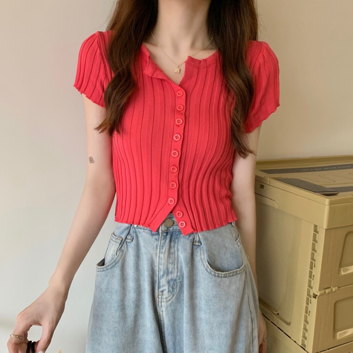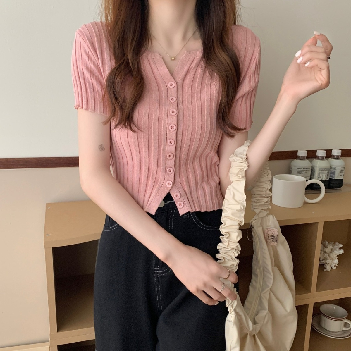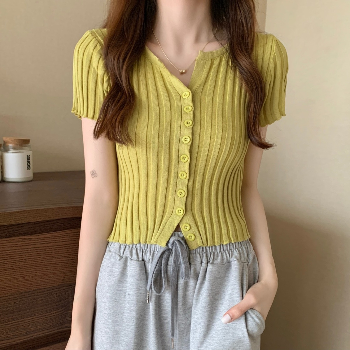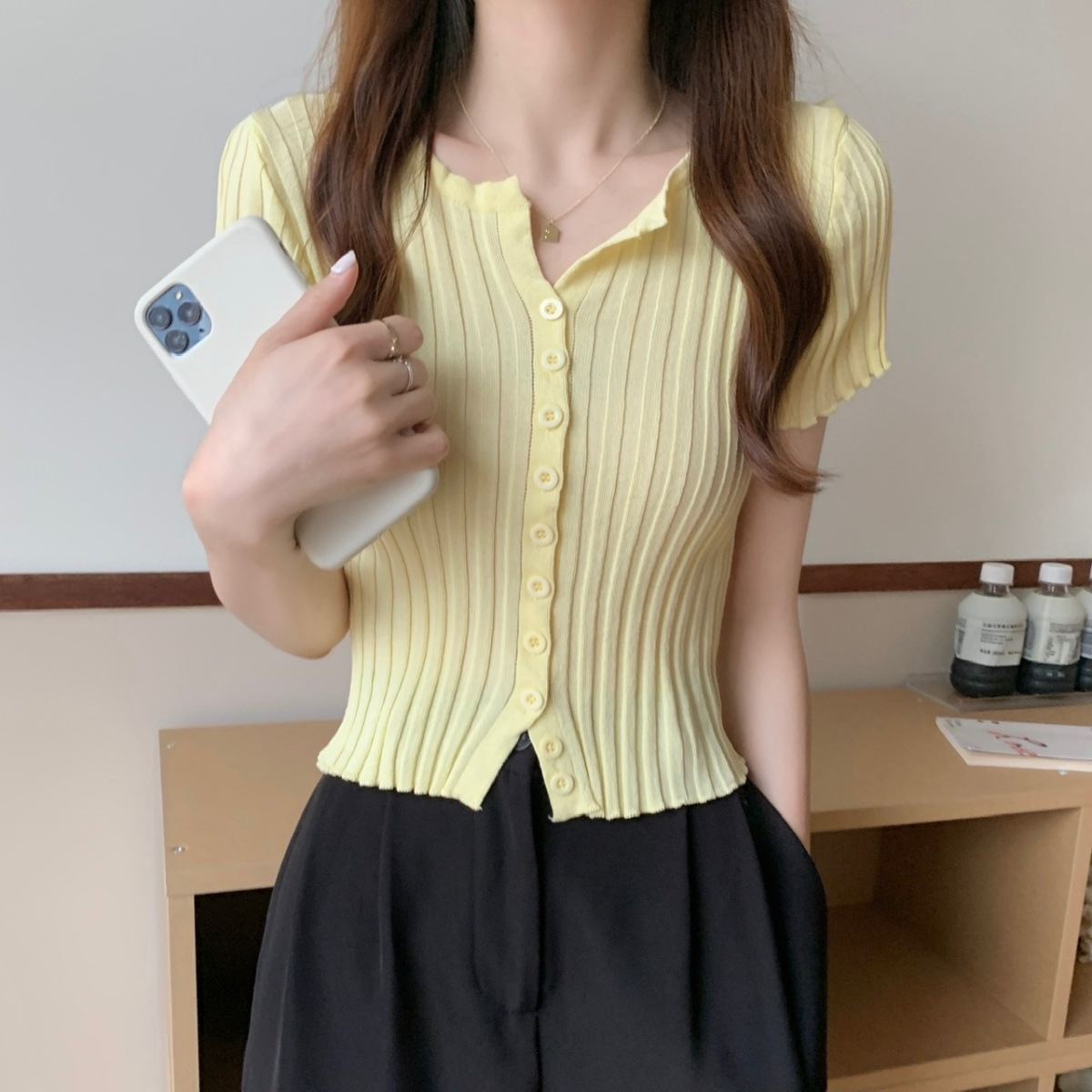 블랙 크롭 하이웨이스트 니트 반팔 티셔츠 여성용 핫걸 타이트핏 숏탑 여름 얇은 스타일 2026 신상스토어 가기
