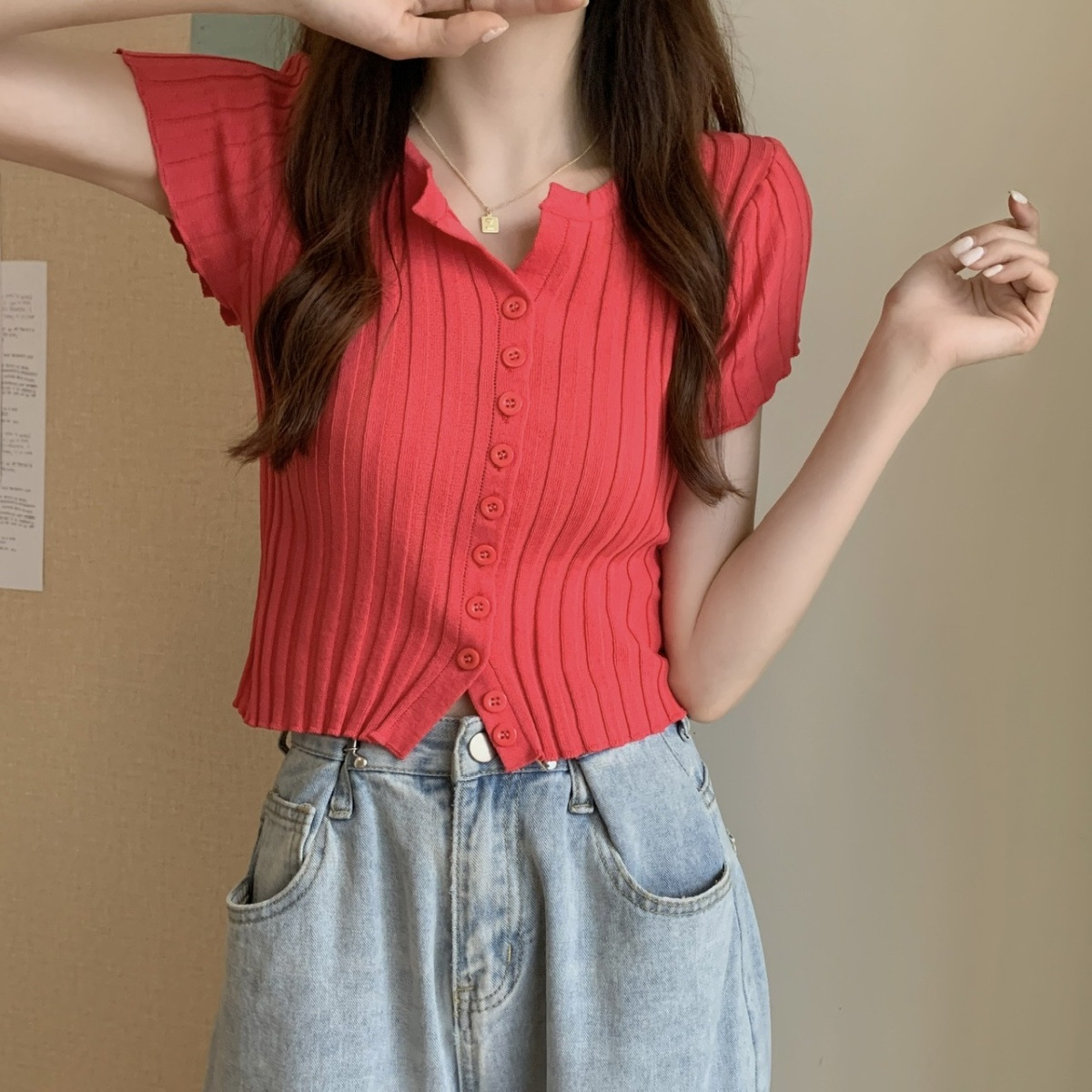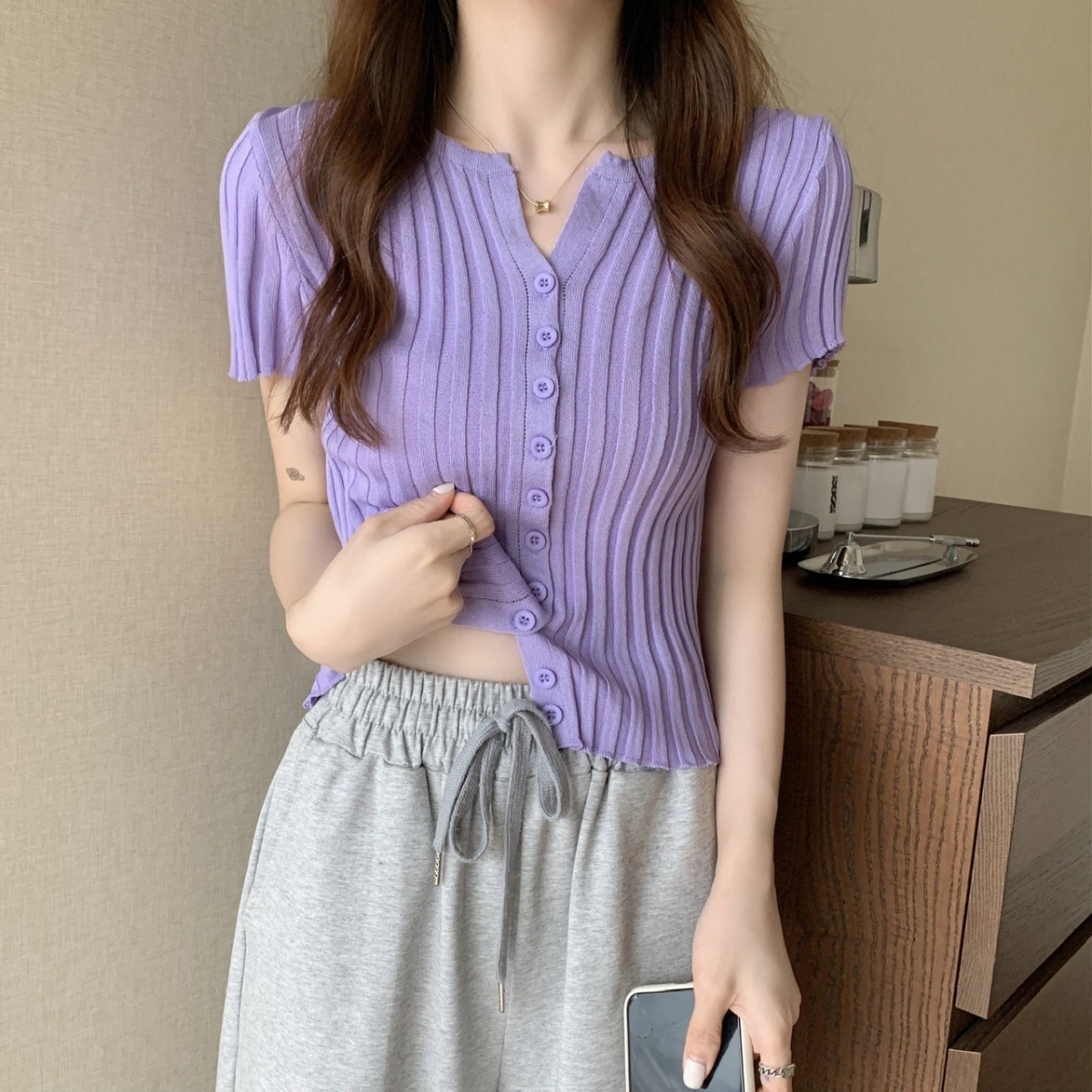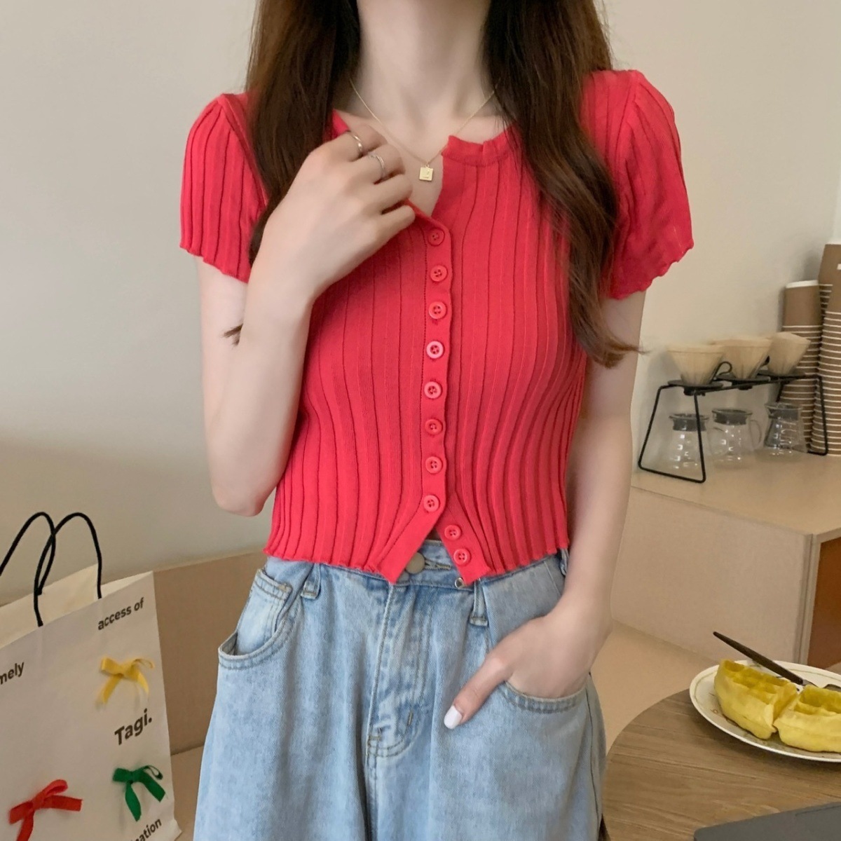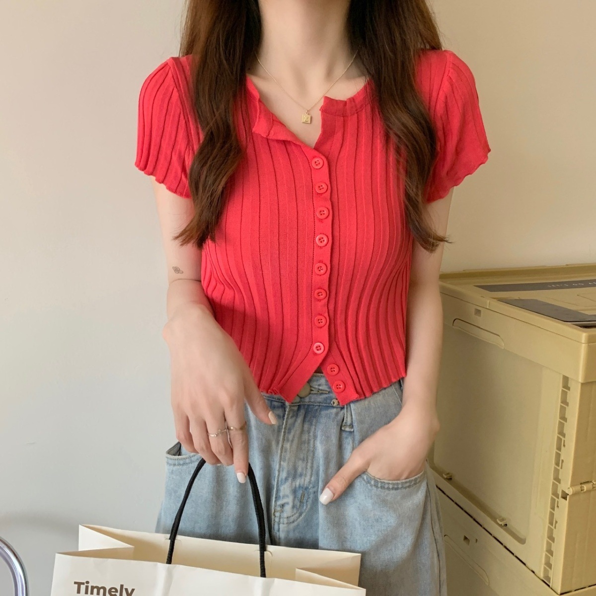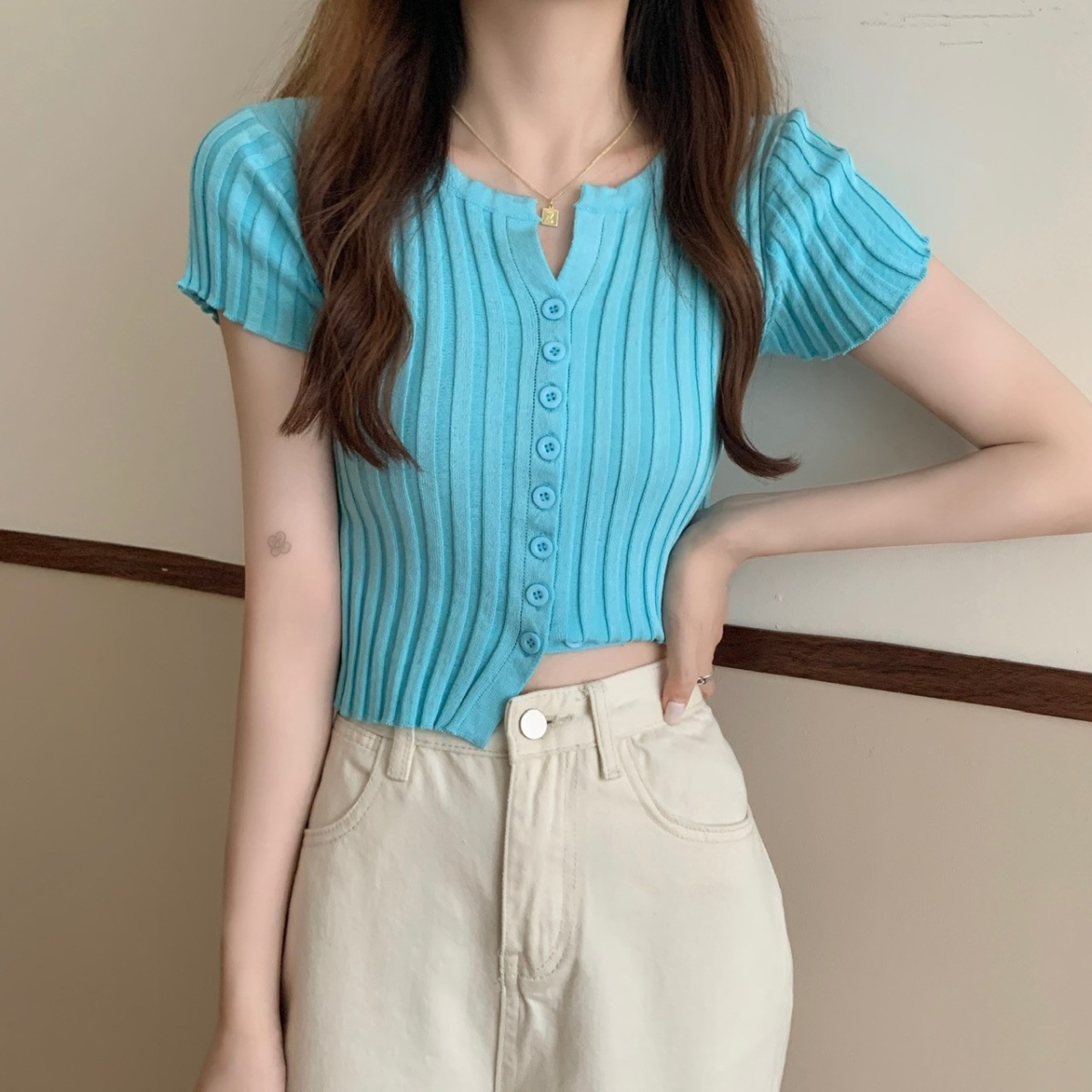 블랙 크롭 하이웨이스트 니트 반팔 티셔츠 여성용 핫걸 타이트핏 숏탑 여름 얇은 스타일 2026 신상스토어 가기