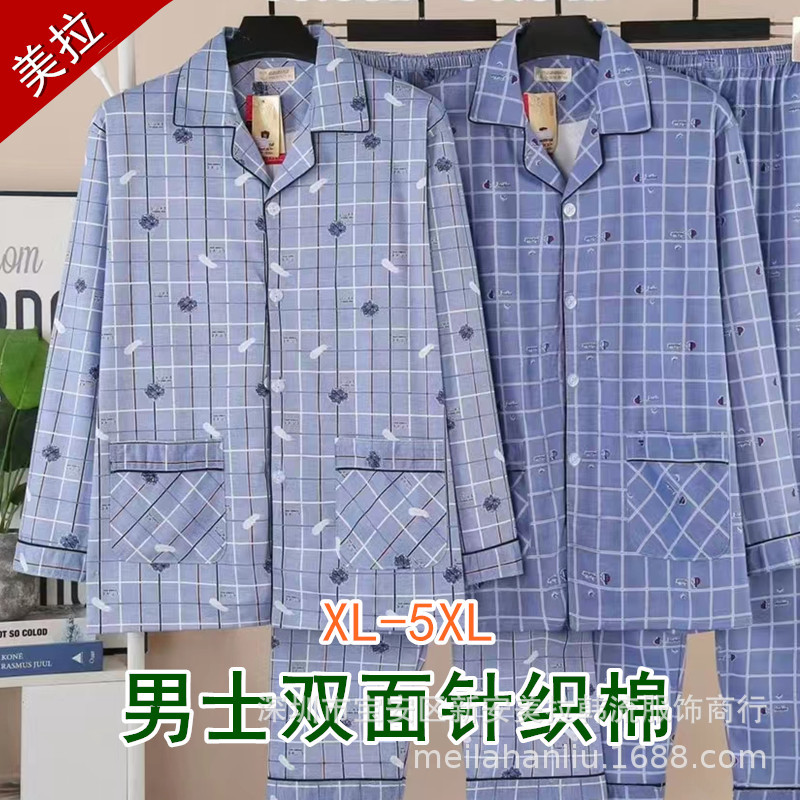 봄과 가을 남자 긴 소매 카디건 홈 의류 니트 코튼 여름 남성 중년 잠옷 격자 캐주얼 세트 남성 5XL스토어 가기