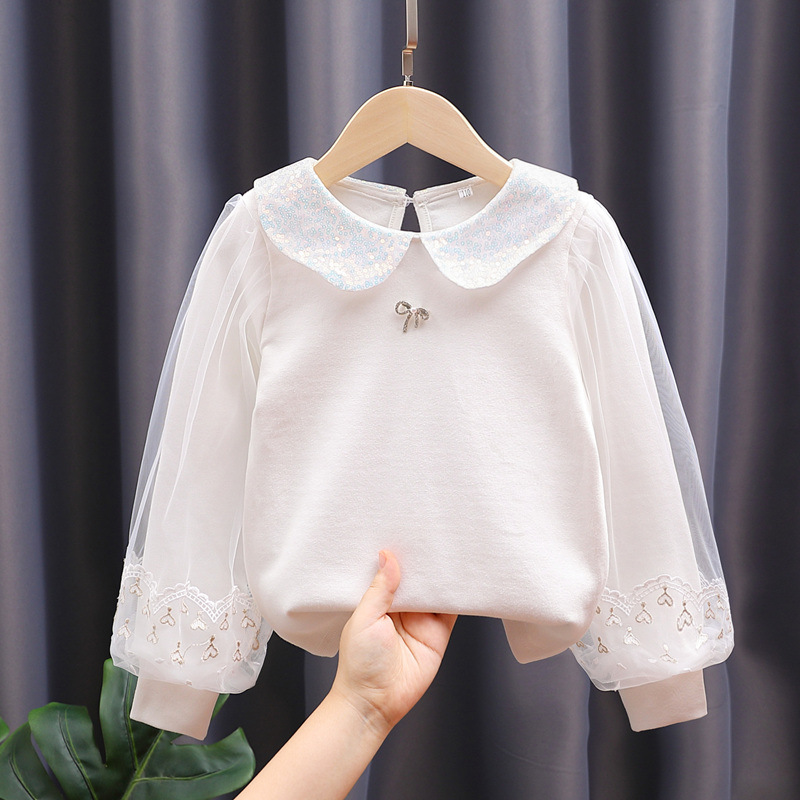 여아 탑 봄과 가을 긴팔 순면 화이트 퍼프 슬리브 베이스 셔츠 어린이 가을 옷 모든 매치 라펠 티셔츠 6