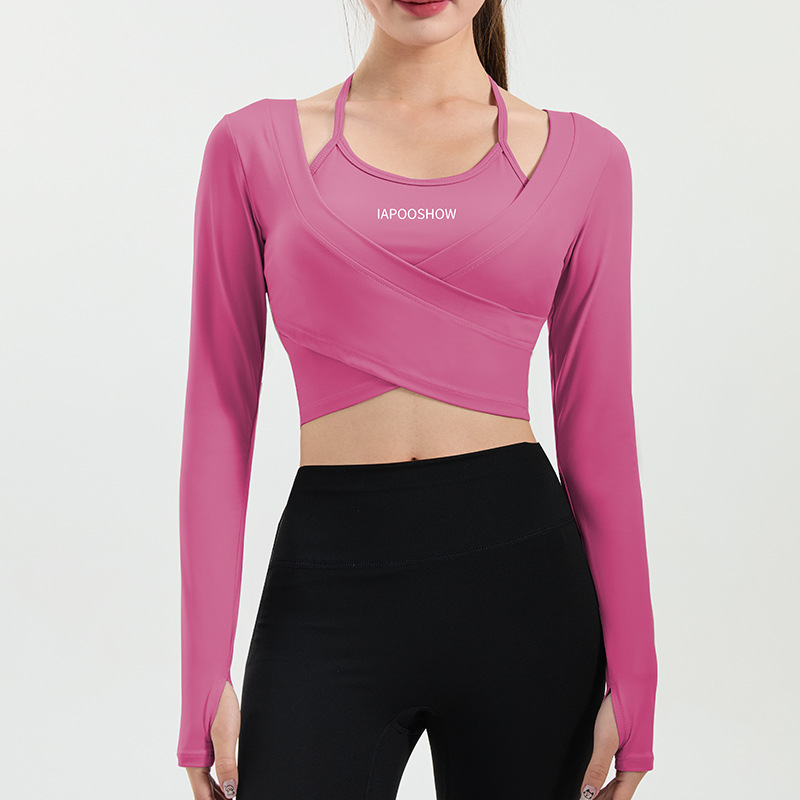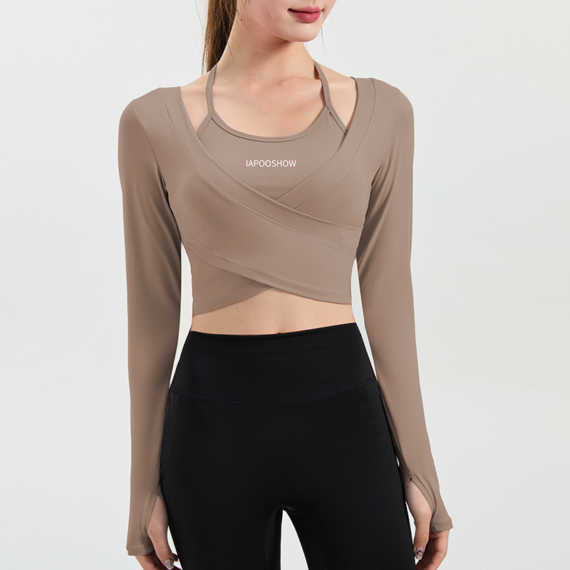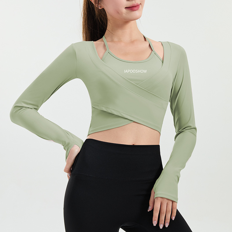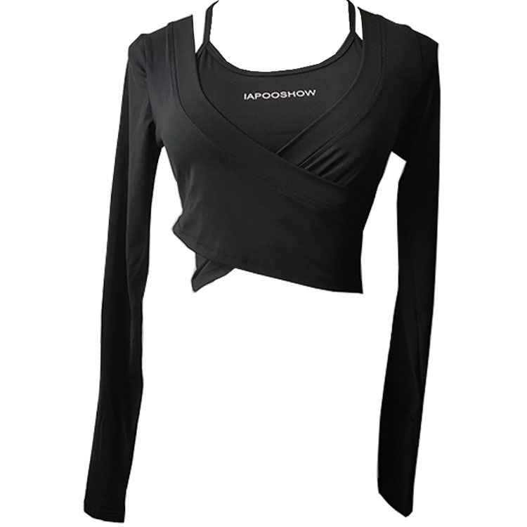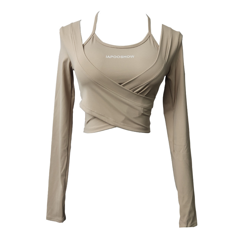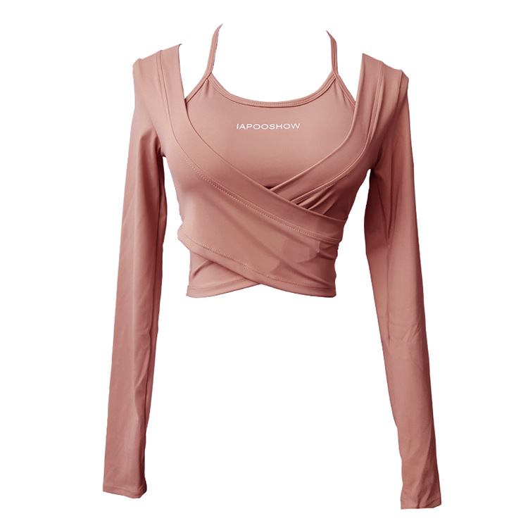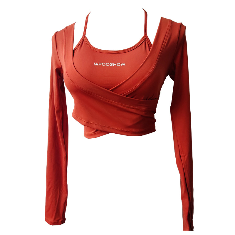 가슴 매트가있는 세련된 인쇄 가짜 투피스 스포츠 긴팔 요가 의류 울트라 짧은 배꼽 탑 속건 슬리밍 피트니스 의류