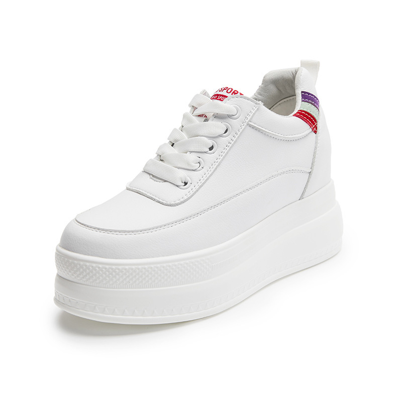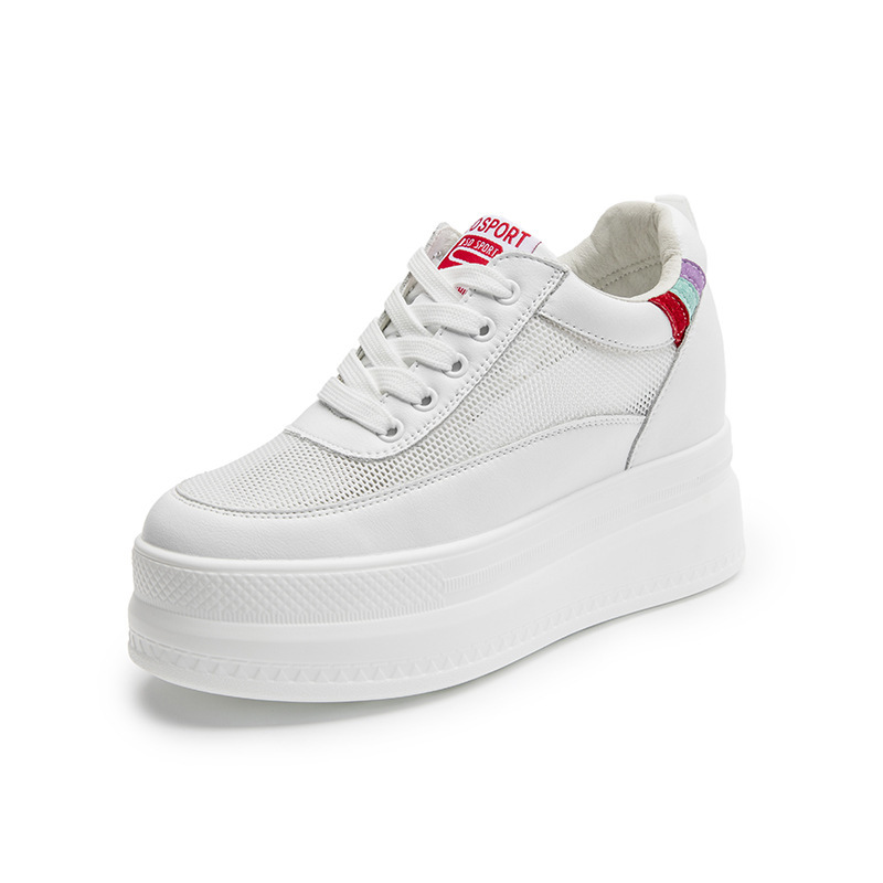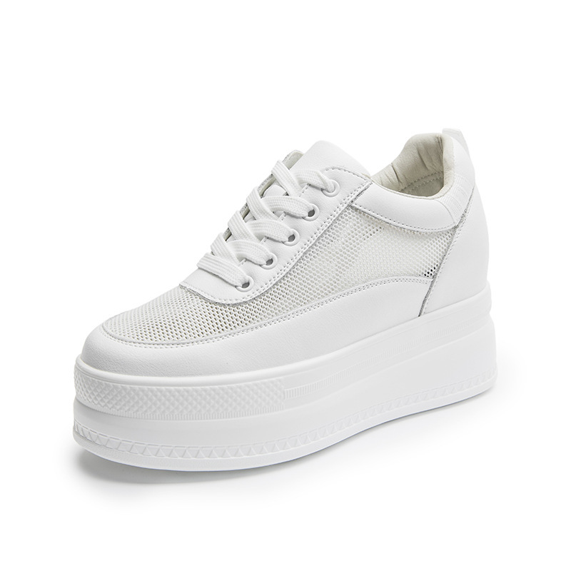 봄과 여름 2023 새로운 스타일 머핀 두꺼운 바닥 증가 가죽 여성 신발 메쉬 흰색 신발 모든 매치 캐주얼 운동화