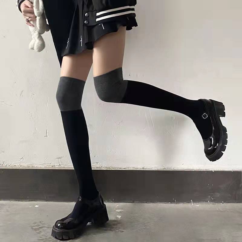 컬러 매칭 양말 여성용 인 트렌디 한 모든 매치 가을 블랙 및 그레이 스티치 무릎 위 양말 하이 컬러 밸류 모리 스타일 블랙 커프 양말스토어 가기