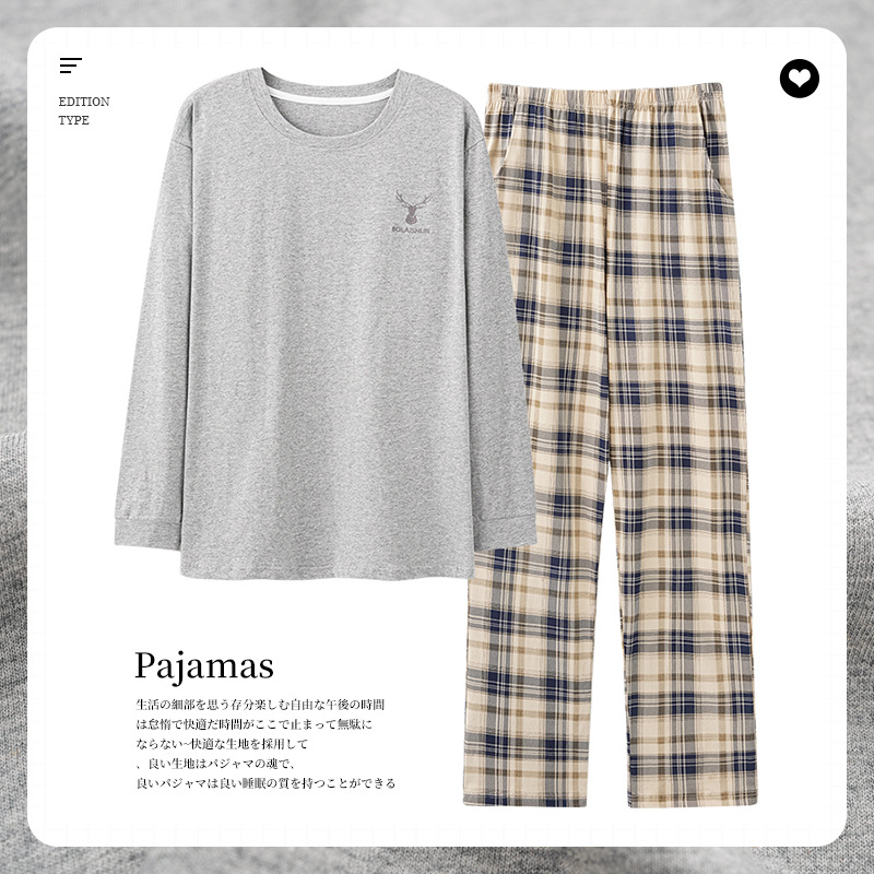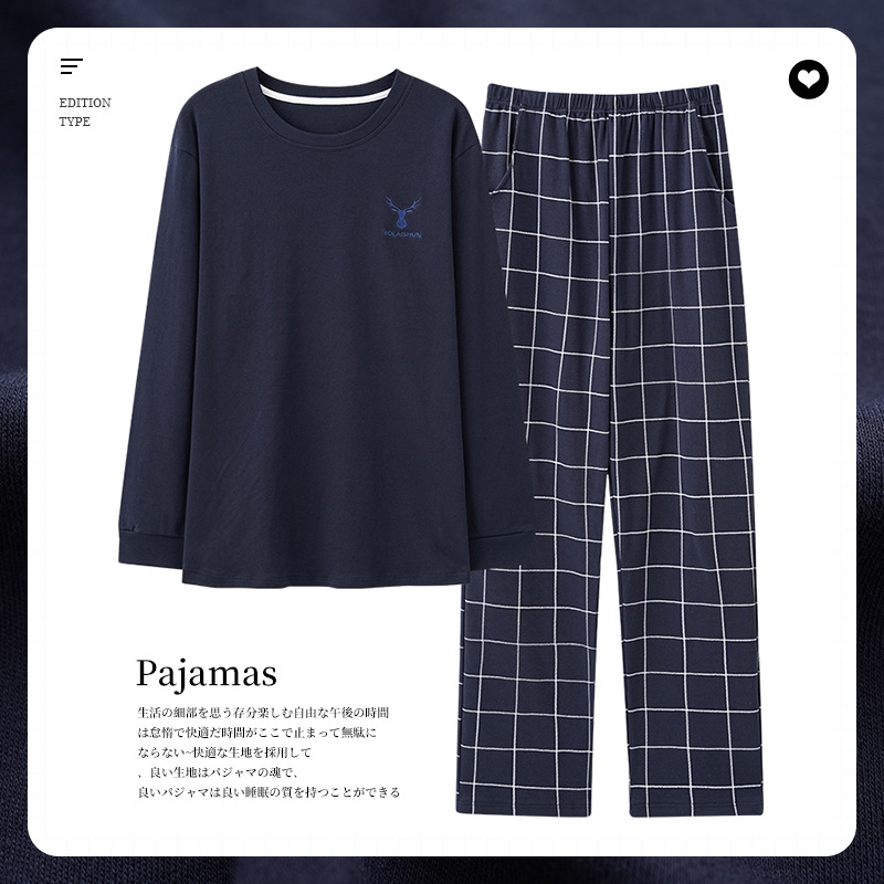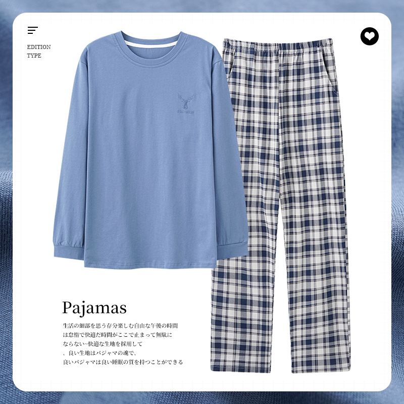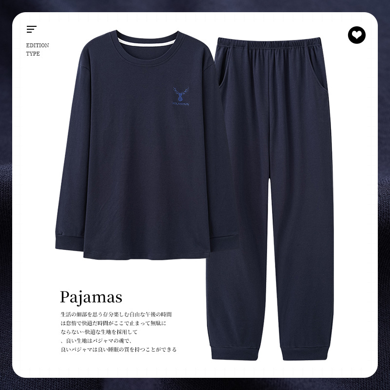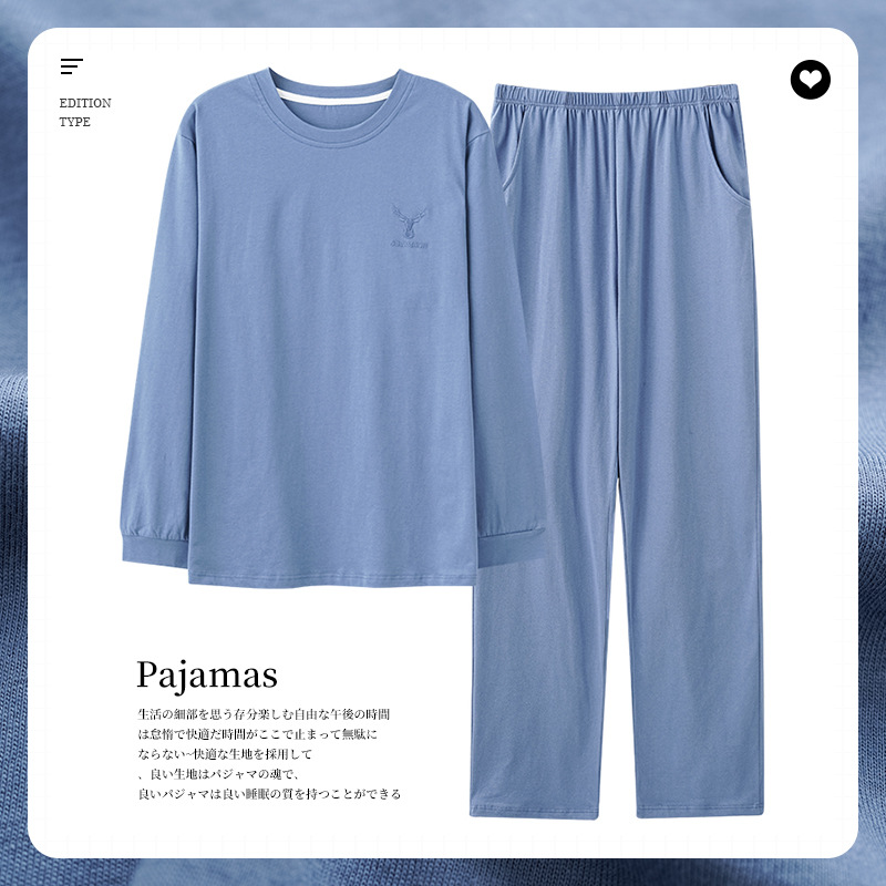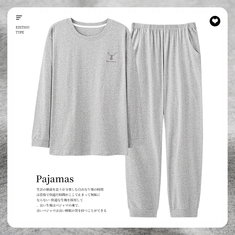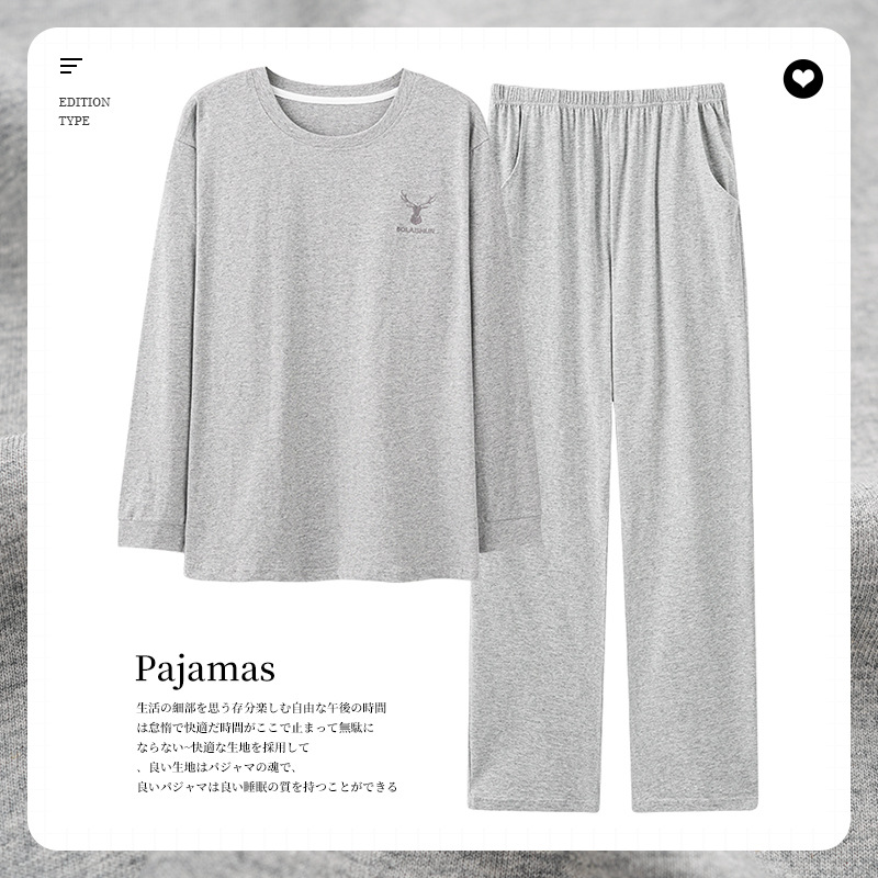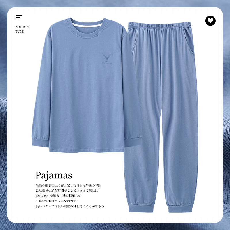 가을과 겨울 새로운 잠옷 투피스 세트 남자의 순면 간단한 라운드 넥 풀오버 긴 소매 바지 간단한 가정 의류 세트스토어 가기