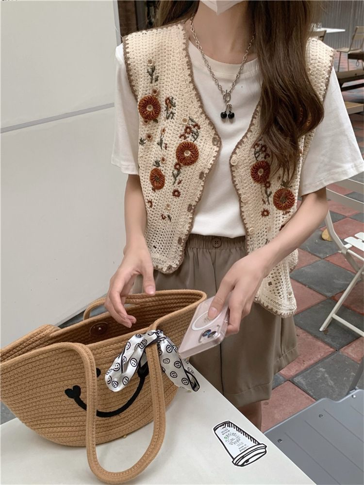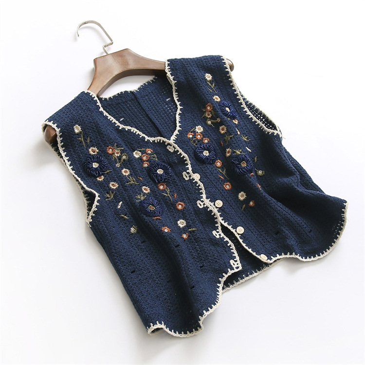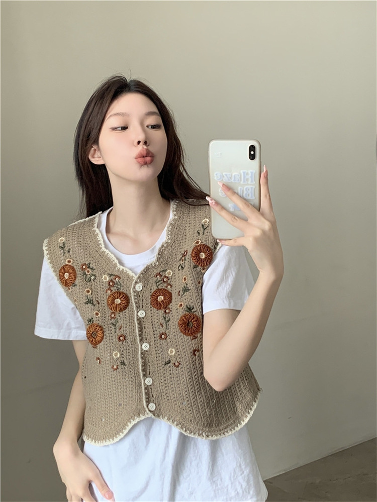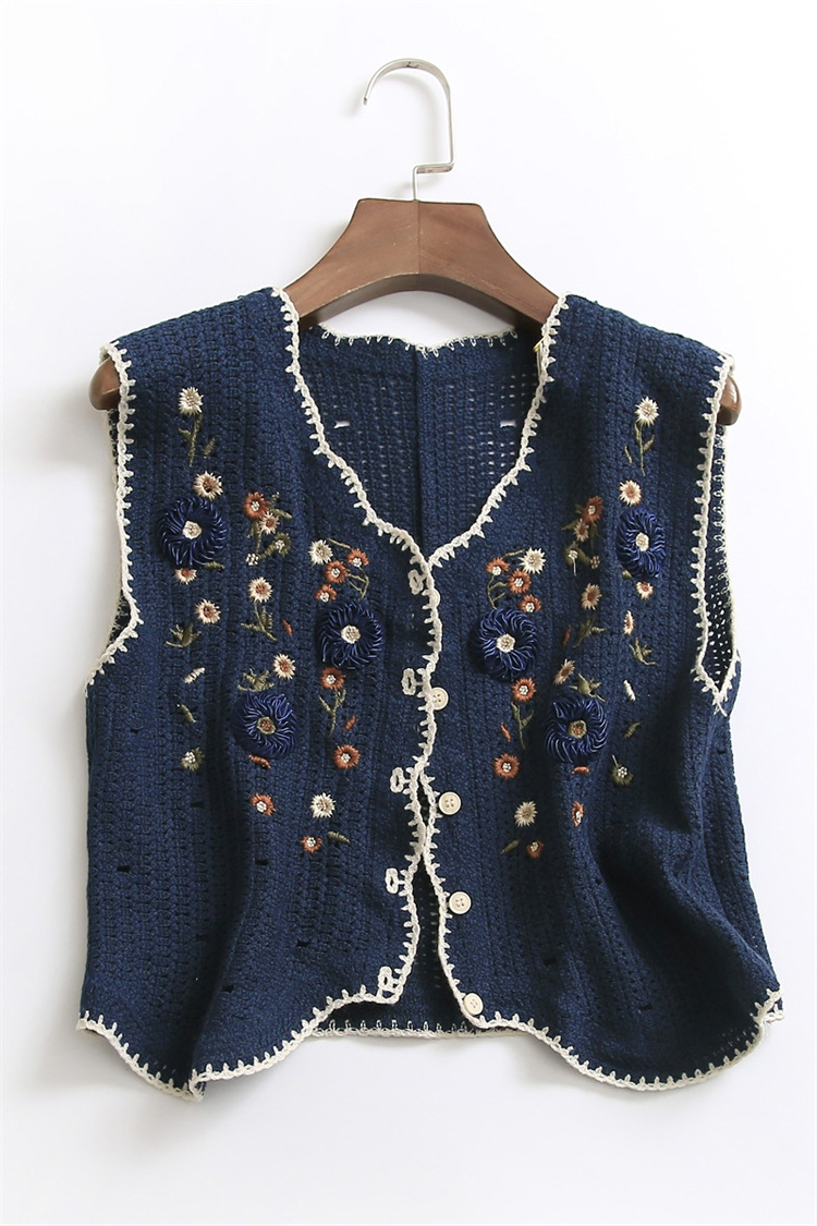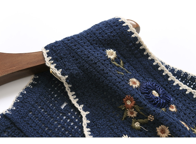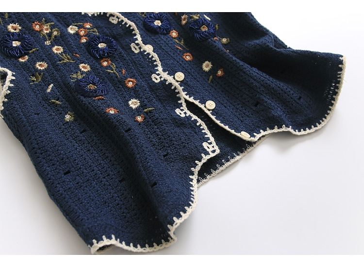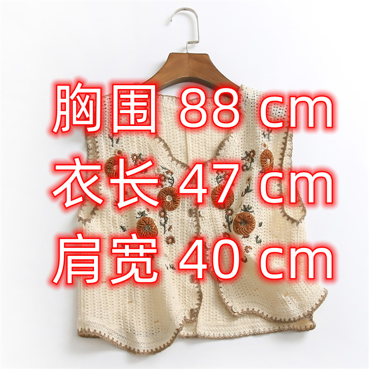 에스닉 스타일 자수 조끼 V 넥 외부 중공 민소매 자수 짧은 여성용 카디건 탑 니트 스웨터