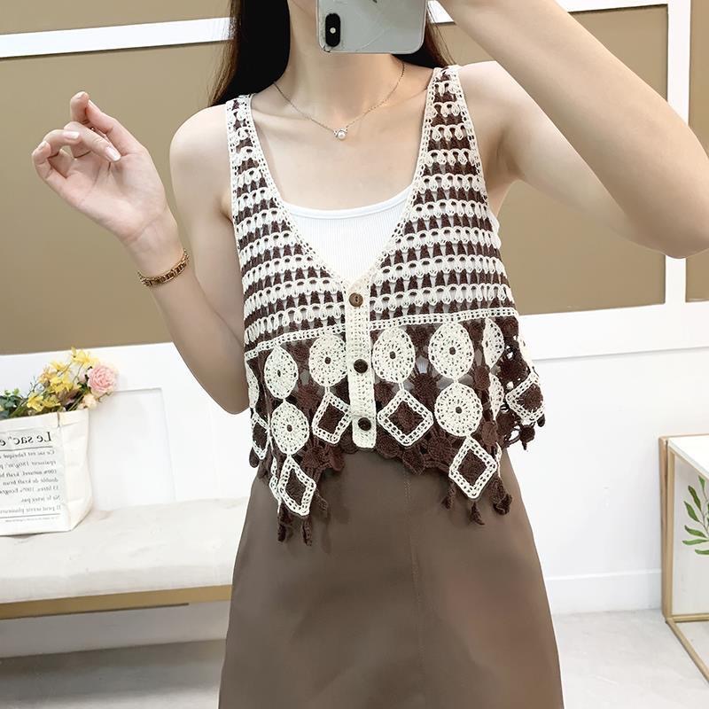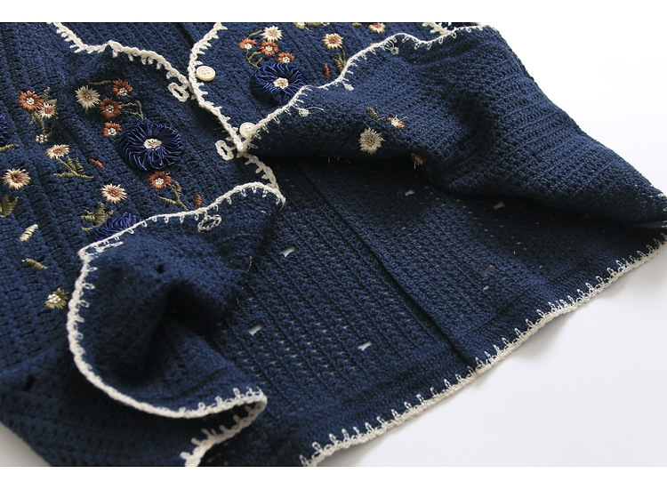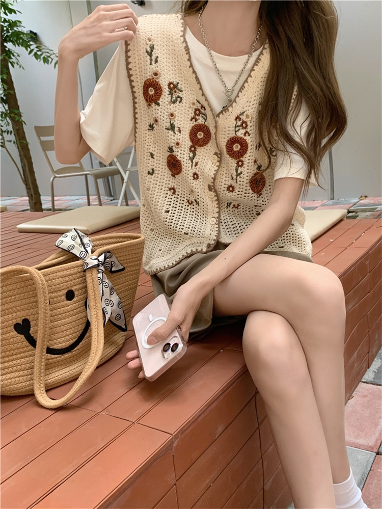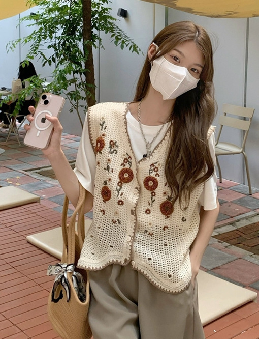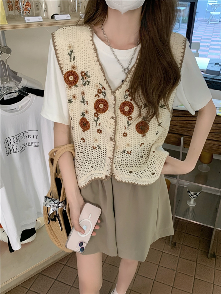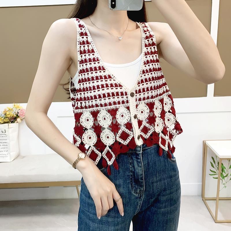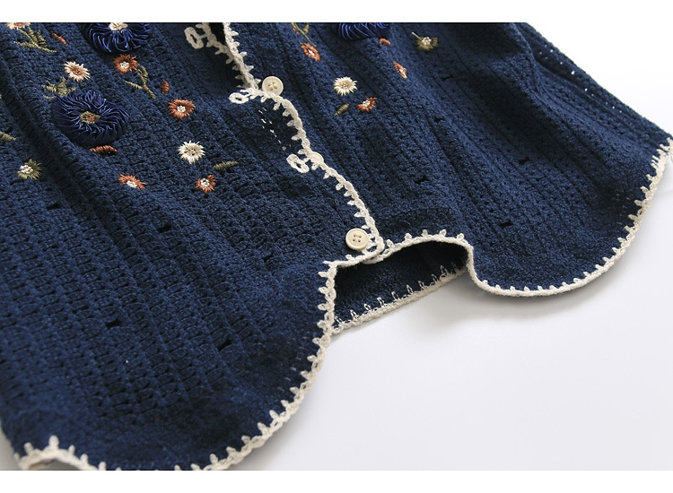 에스닉 스타일 자수 조끼 V 넥 외부 중공 민소매 자수 짧은 여성용 카디건 탑 니트 스웨터