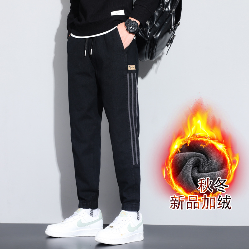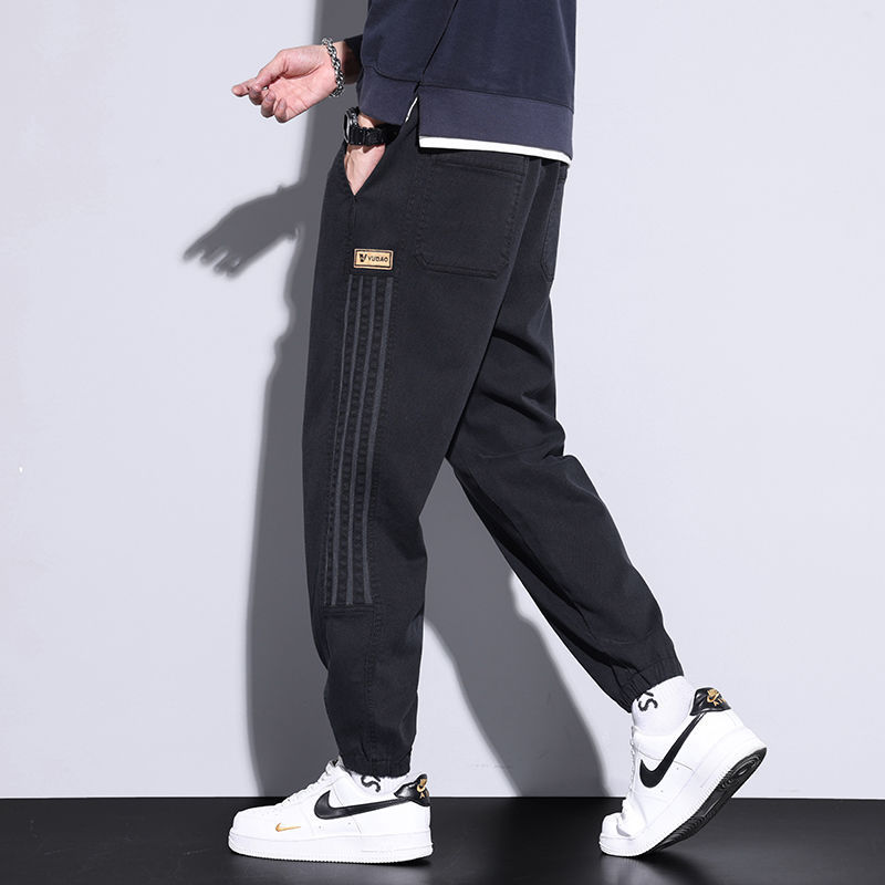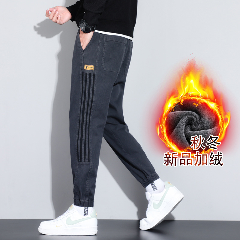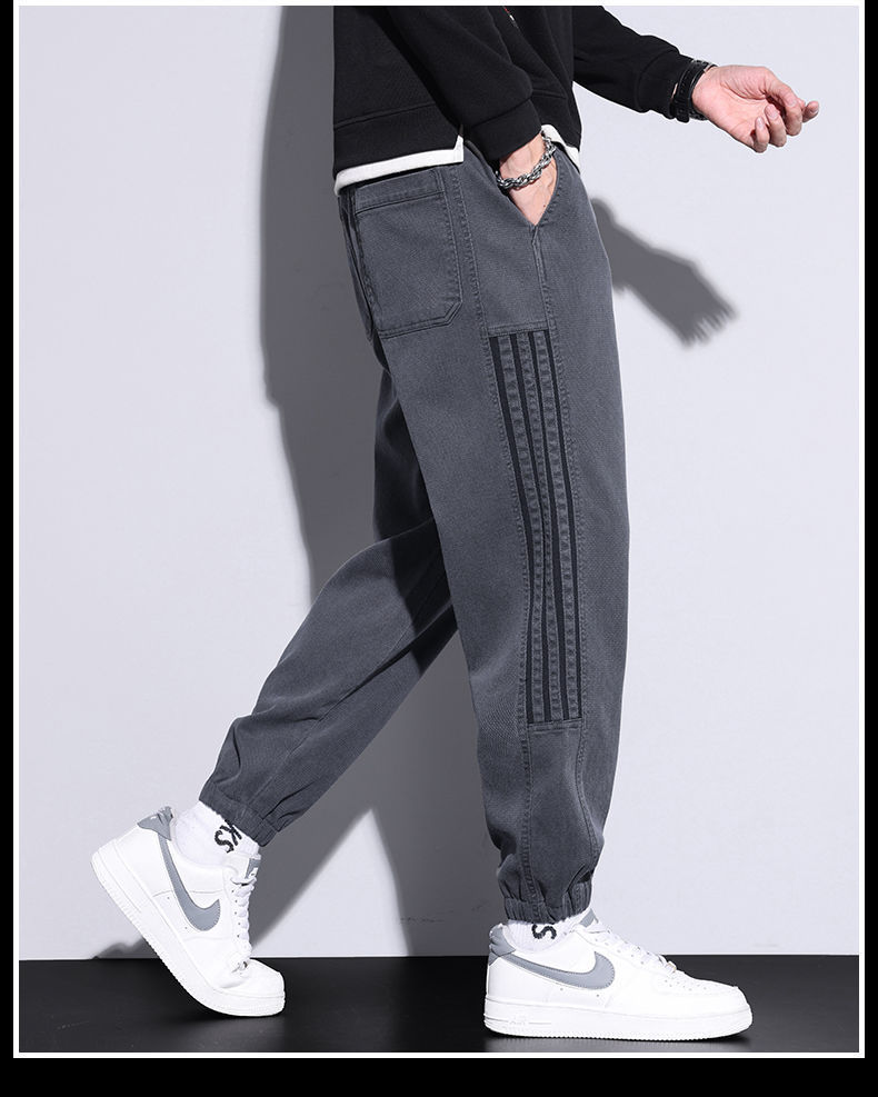 두오유 가을 신상 남성 캐주얼 바지 스트라이프 디자인 루즈핏 조거 팬츠 하렘 롱 팬츠 남성용 기모 안감