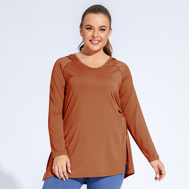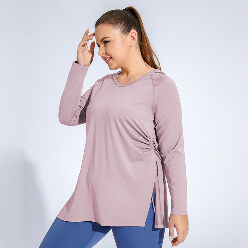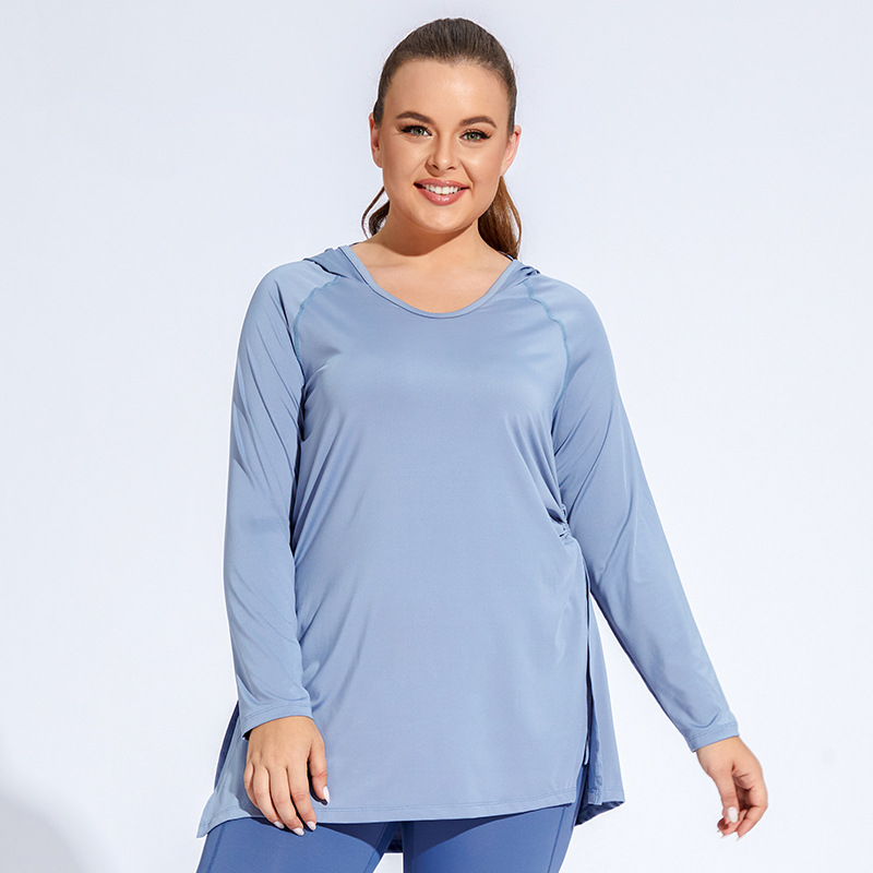 플러스 사이즈 피트니스웨어 후드 긴 소매 요가 꽉 통기성 스포츠 탑 롱 러닝 블라우스 여성용 속건 티셔츠