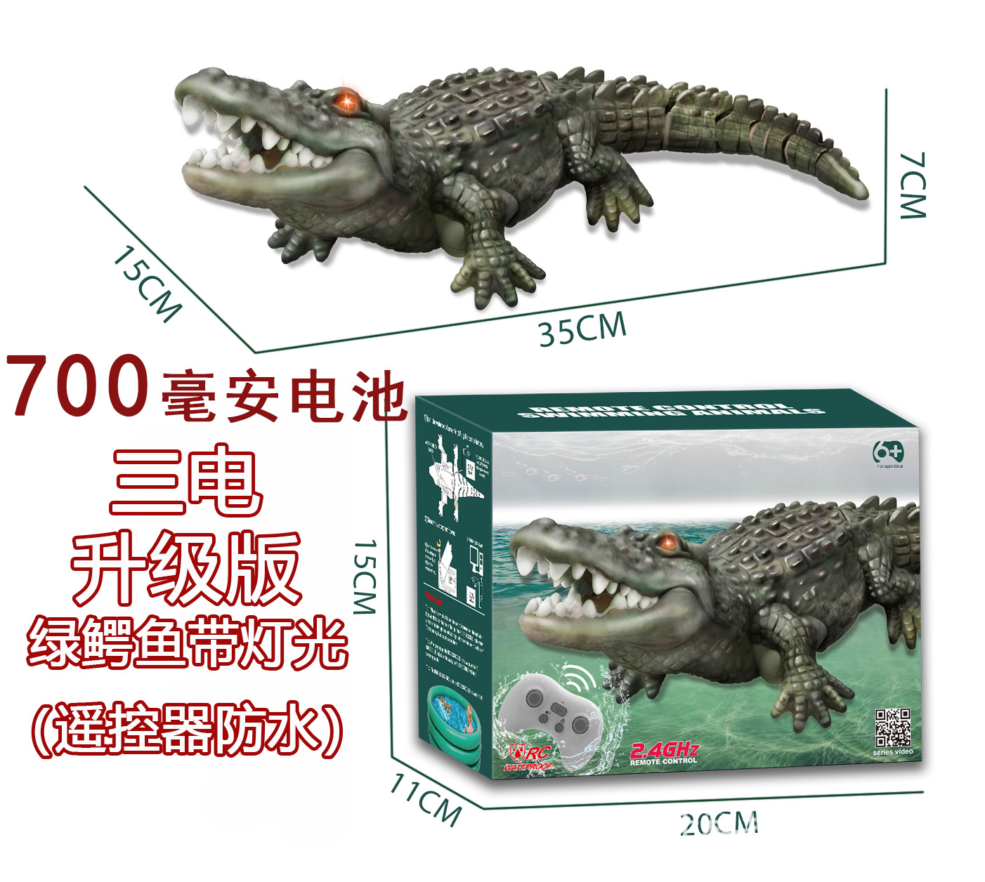 • 빛이있는 녹색 악어의 3 가지 전기 * 업그레이드 버전 (원격 제어 방수)
