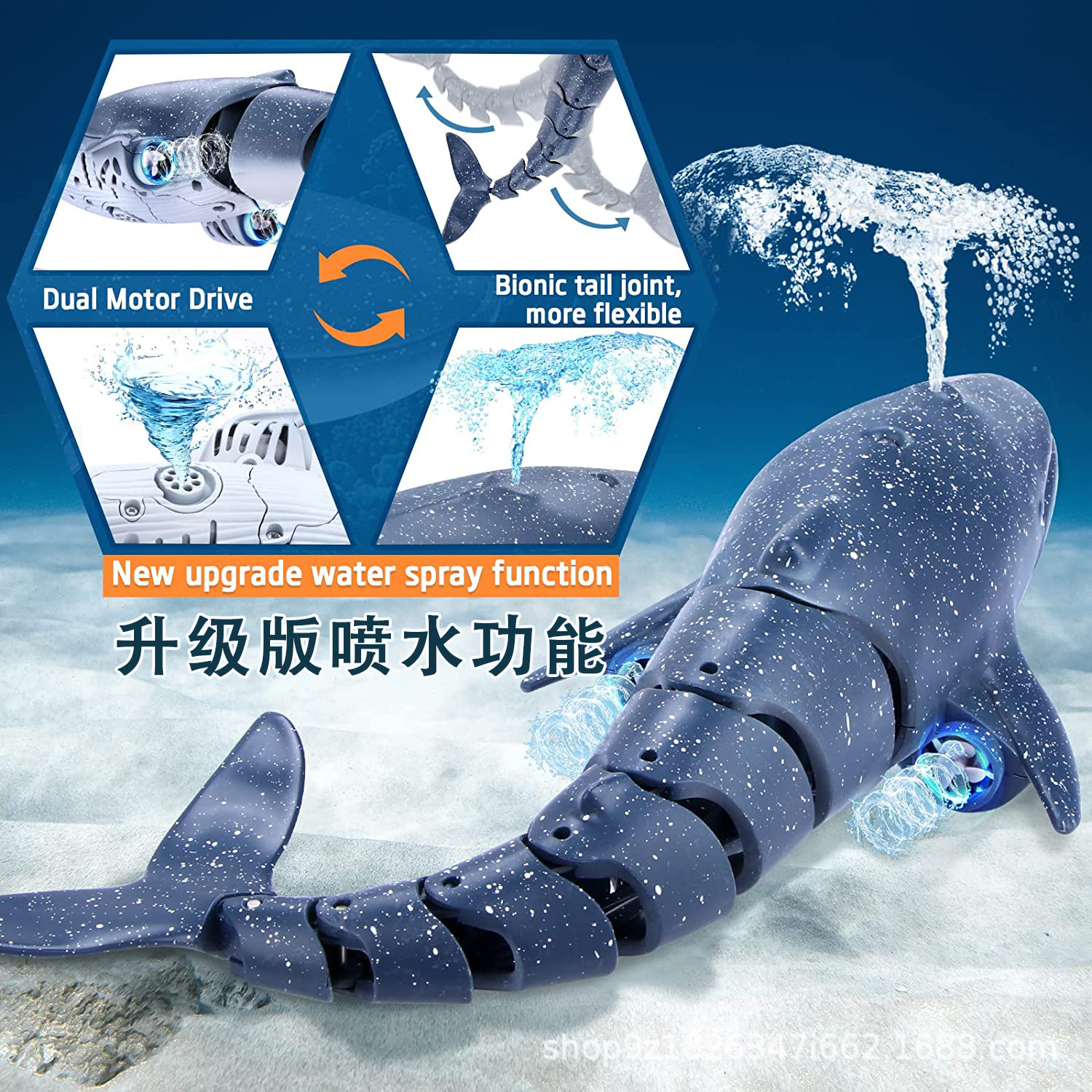 • 遥控玩具鲨鱼鲸鱼鳄鱼喷水灯光充电500毫安仿生超长续航水上玩具折扣价:¥52.0