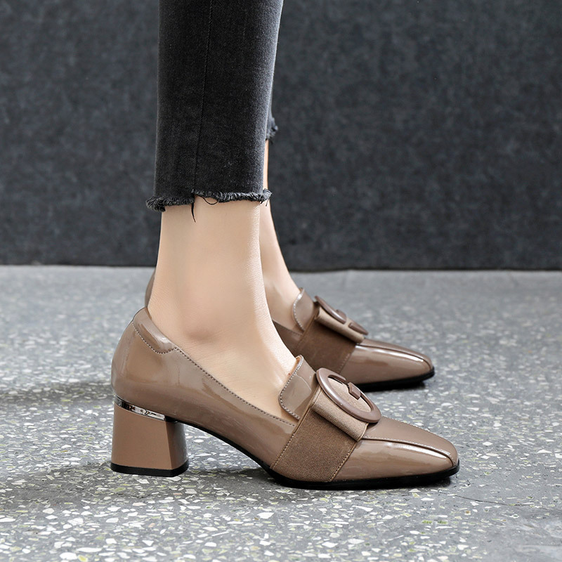 봄과 여름 새로운 스퀘어 토 여성 신발 청키 단색 한국 패션 영국 스타일 패션 캐주얼 하이힐 여성 싱글 슈즈