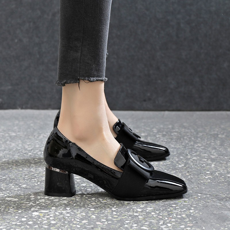봄과 여름 새로운 스퀘어 토 여성 신발 청키 단색 한국 패션 영국 스타일 패션 캐주얼 하이힐 여성 싱글 슈즈스토어 가기