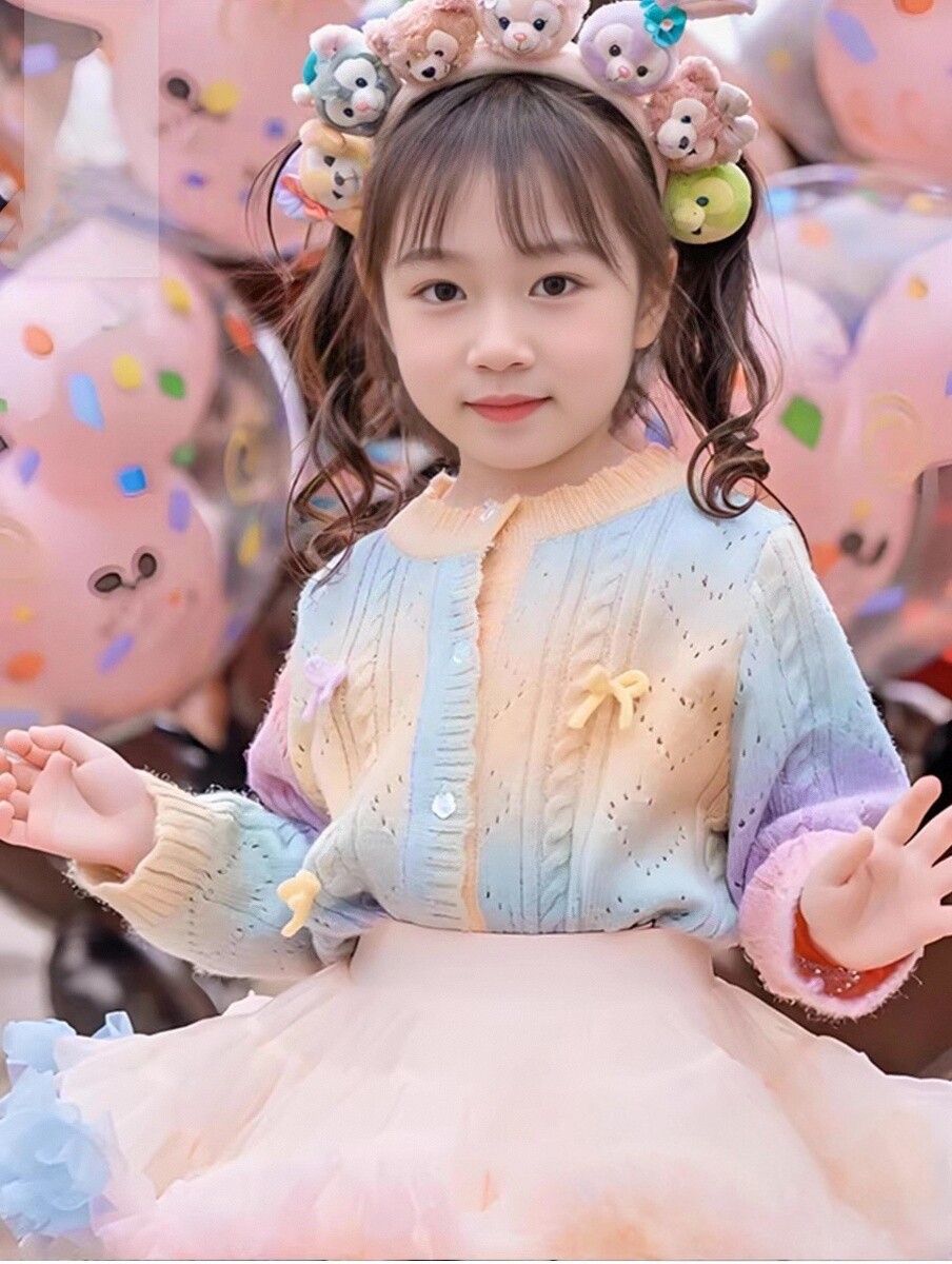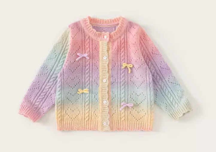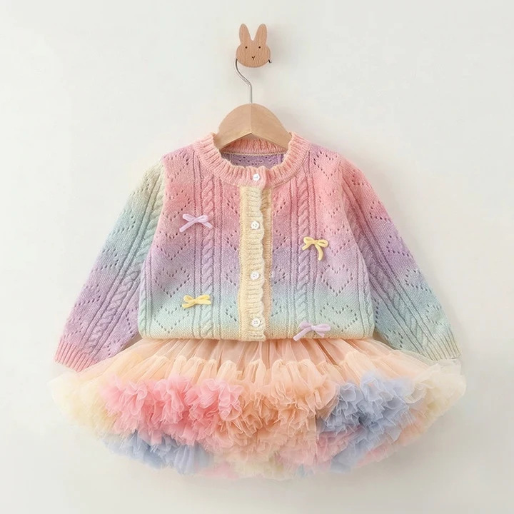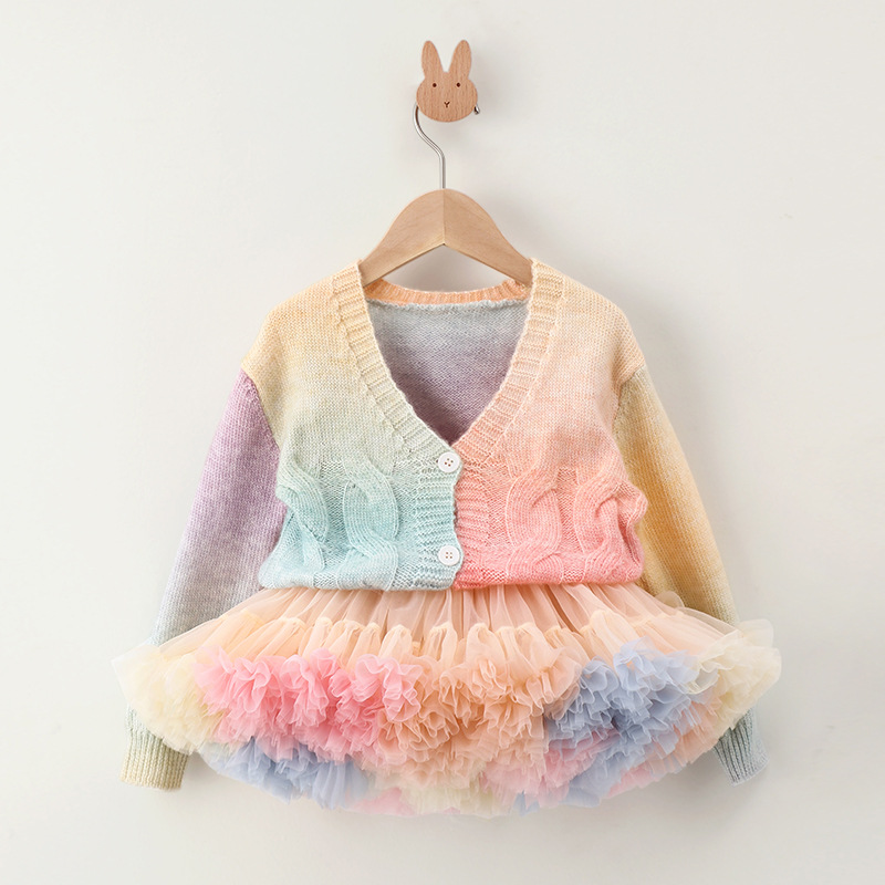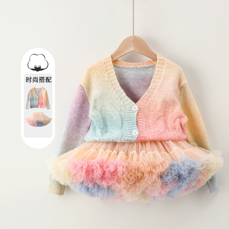 이우 리프 소녀의 가을 레인보우 니트 가디건 재킷 TUTU 스커트 매칭 탑 메쉬 하프 스커트