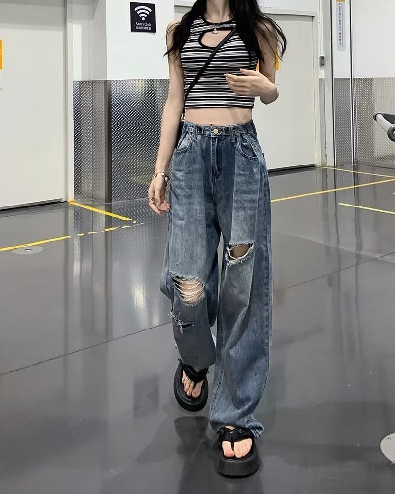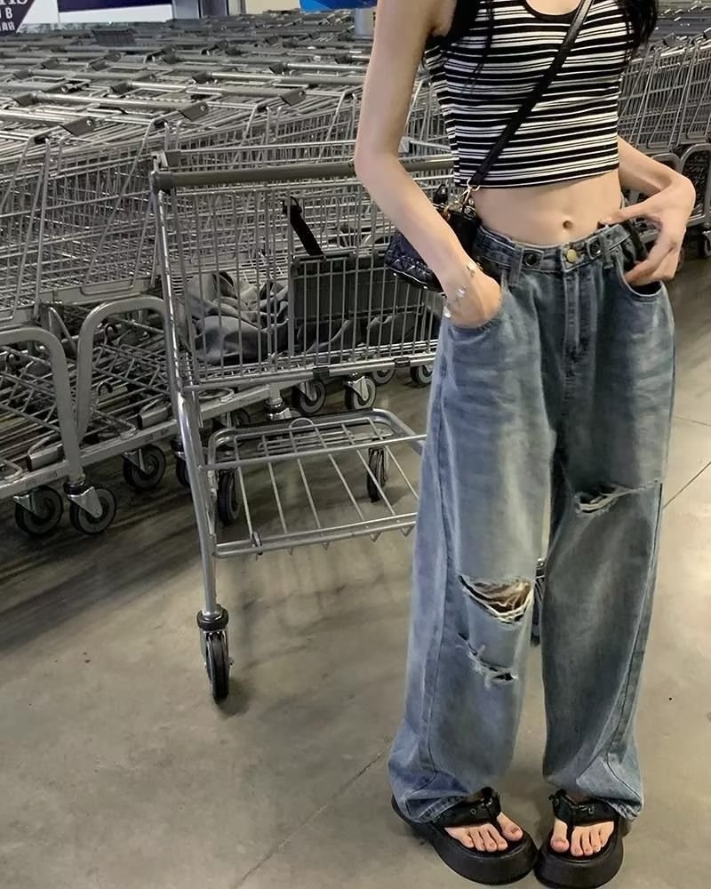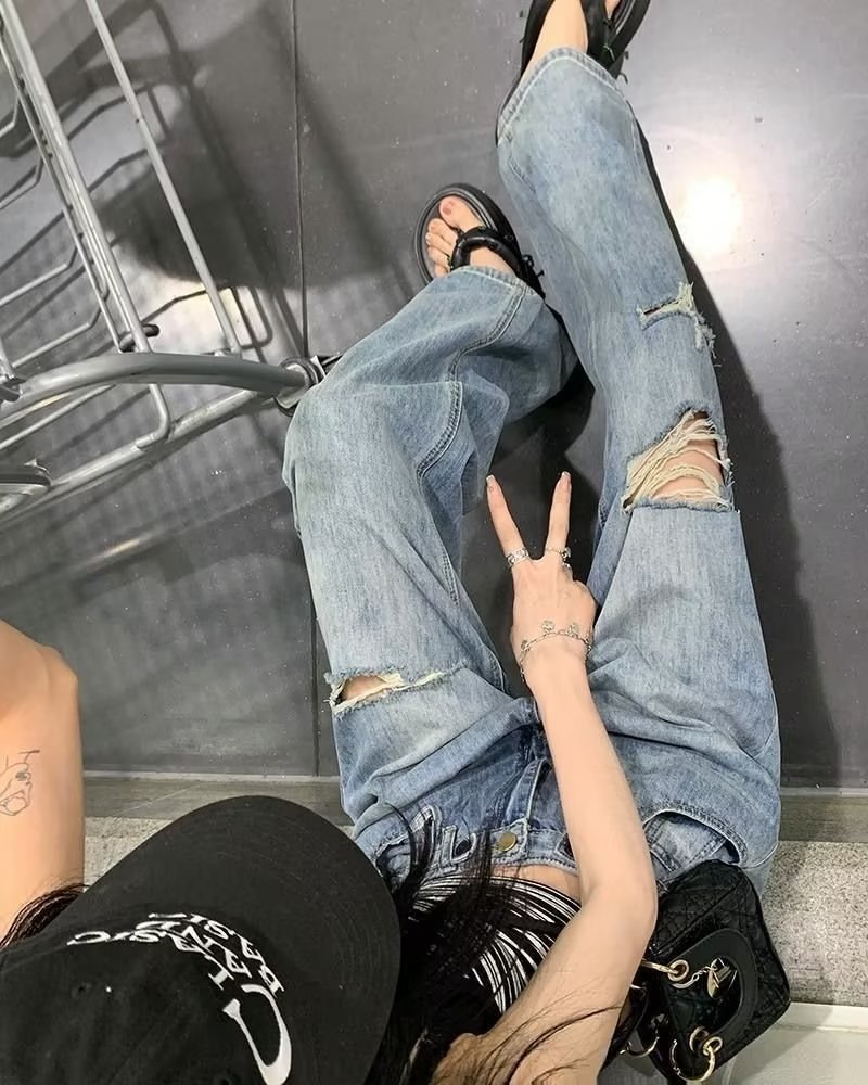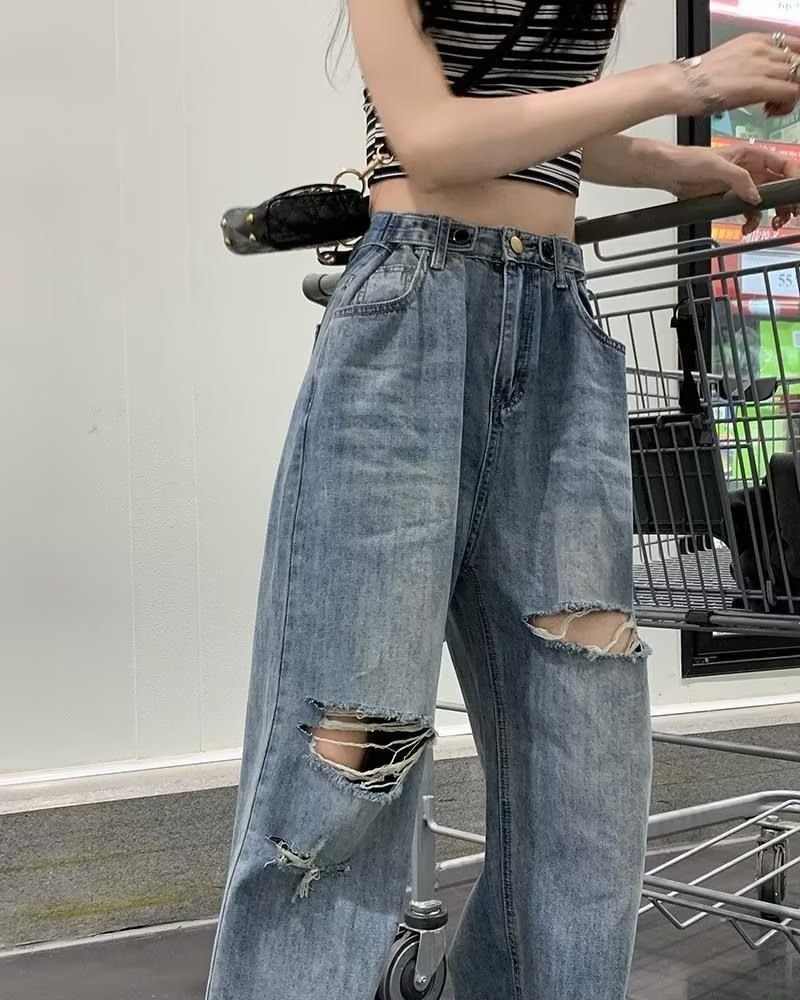 미국의 하이 스트리트 찢어진 청바지 여성의 가을 하이 웨이스트 슬리밍 느슨한 캐주얼 스트레이트 와이드 레그 걸레 팬츠 인스토어 가기