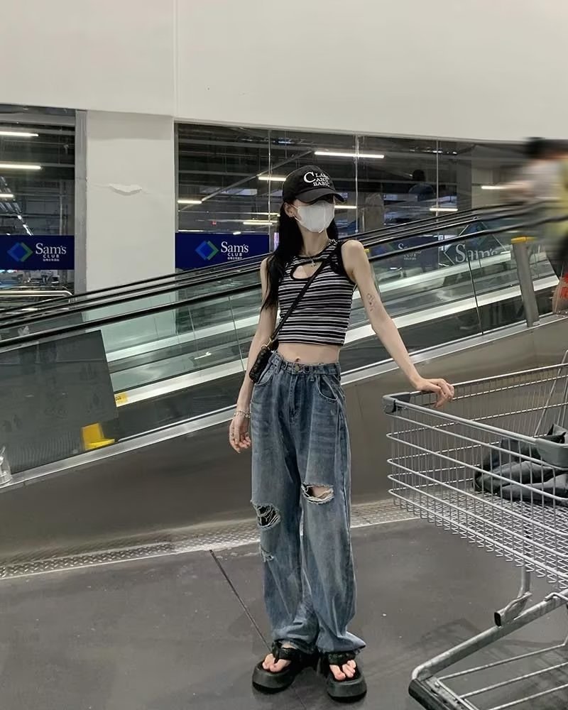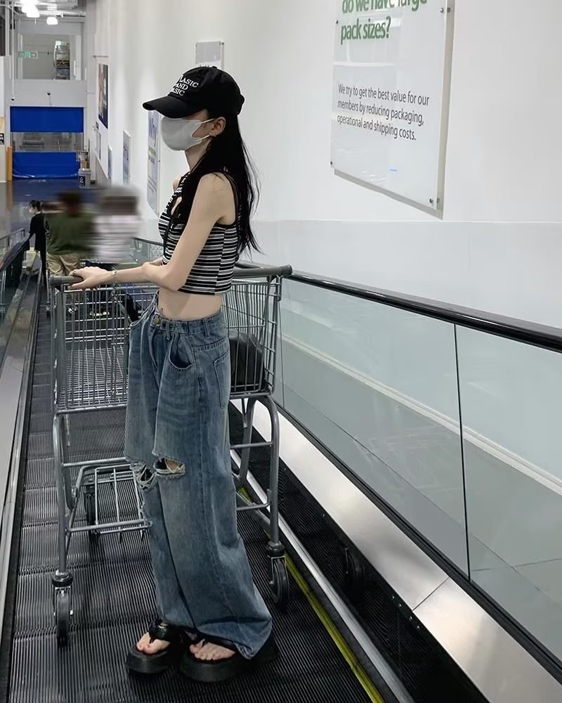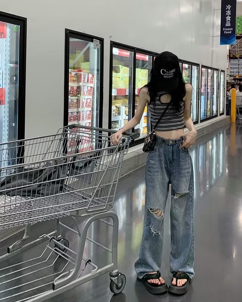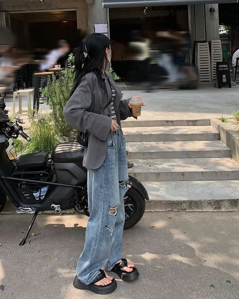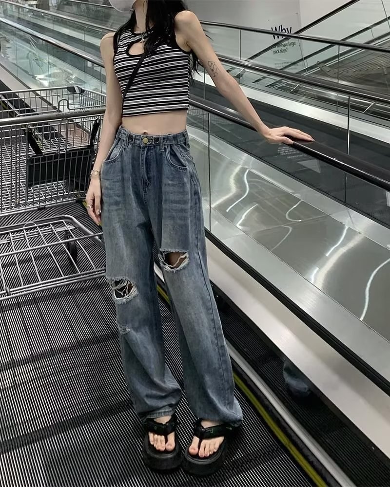 미국의 하이 스트리트 찢어진 청바지 여성의 가을 하이 웨이스트 슬리밍 느슨한 캐주얼 스트레이트 와이드 레그 걸레 팬츠 인스토어 가기