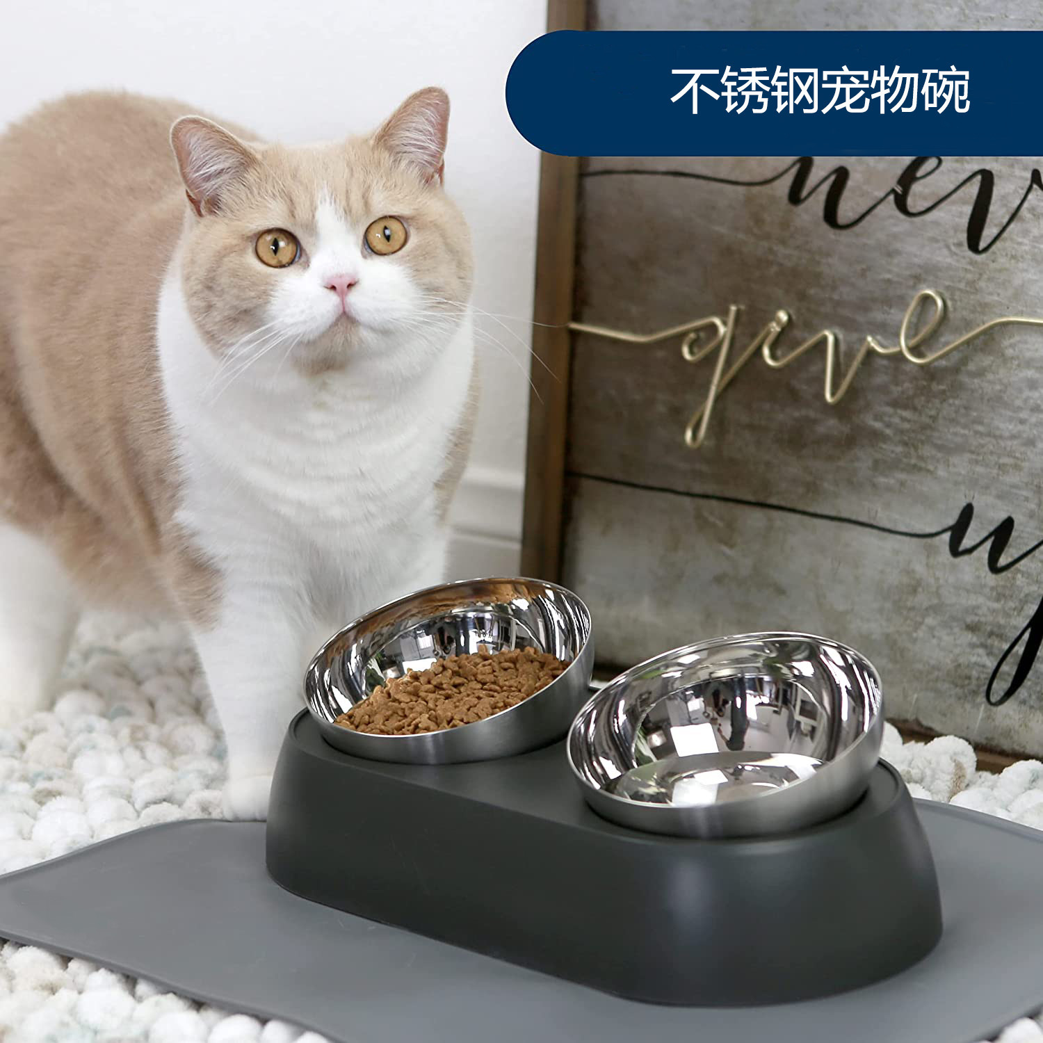 15 ° 고양이 이중 그릇 경추 보호 고양이 음식 분지 미끄럼 방지 노크 방지 스테인레스 스틸 그릇 고양이 물그릇 누수 방지 식품 분지스토어 가기