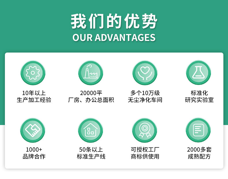 我们专业生产10多年,配方经过多次迭代,口碑不错,欢迎拿样。产品,不能仅仅对比价格,效果非常关键,价格低的产品效果一般大打折扣,一分钱一分货的道理大家都很明白。产品效果如果不好,也很难打开市场。我们的产品,配方经过多次迭代,效果和口感都非常不错,目前已经合作的国内外客户很多,且销量都不错,我们有齐全的国内外资质,国内外的定制订单我们都可以承接。