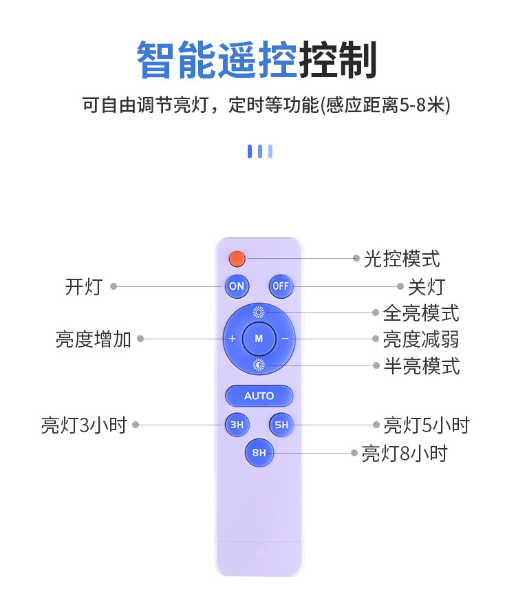 • 엔지니어링 모델: 100W(지능형 조명 제어 + 유도 + 시간 제어 + 어두울 때 자동 조명)