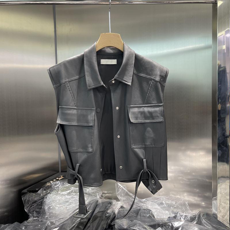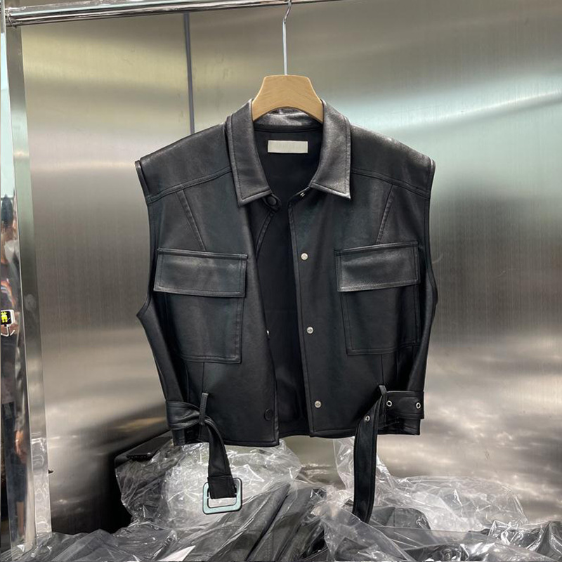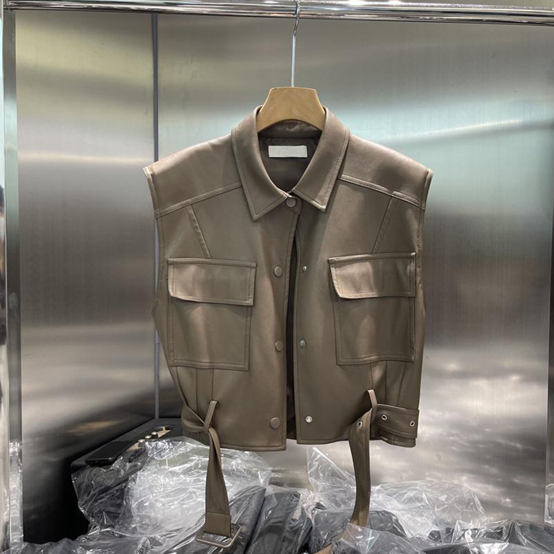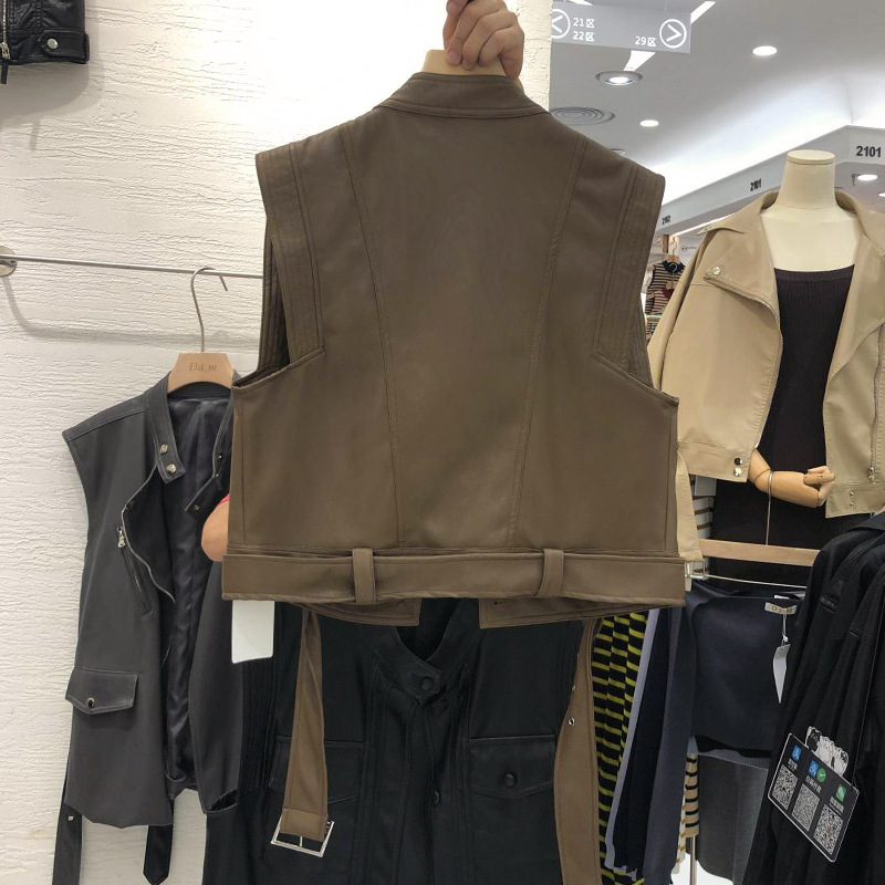 여자 한국 스타일 PU 가죽 조끼 2025 가을 새로운 짧은 느슨한 스탠드 업 칼라 조끼 허리 조끼 재킷