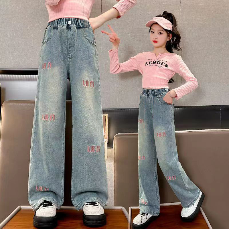 소녀 데님 꽃 바지 2024 새로운 봄과 가을 서양식 캐주얼 슬림 핏 어린이 한국 스트레치 바지