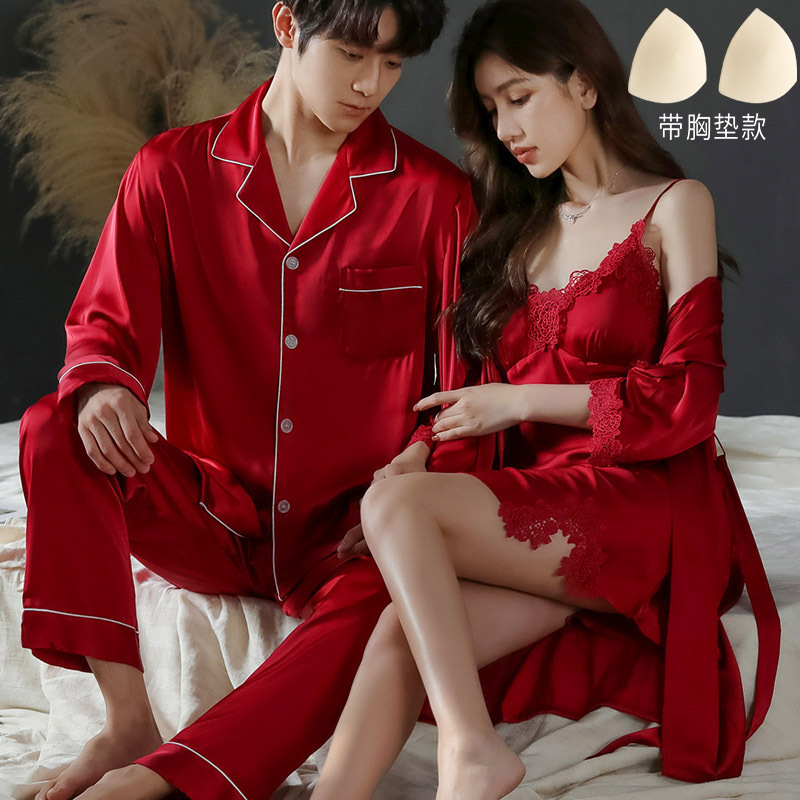 커플 잠옷 여자의 봄과 가을 얼음 실크 긴 소매 결혼식 신혼 빨간 Benningian 아침 가운 남자의 가정 옷 세트스토어 가기