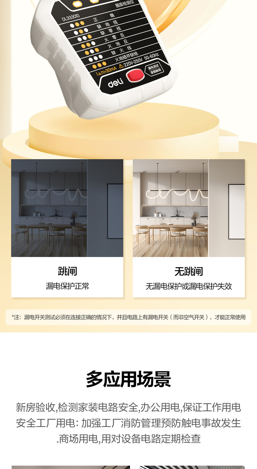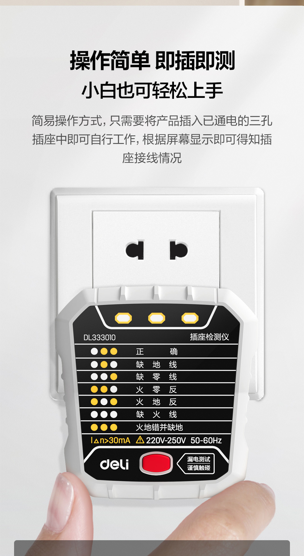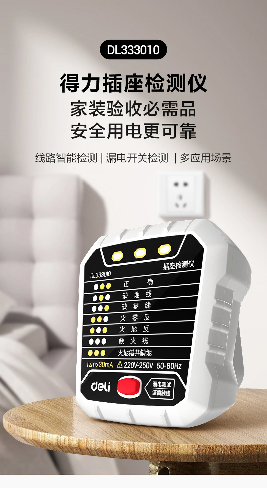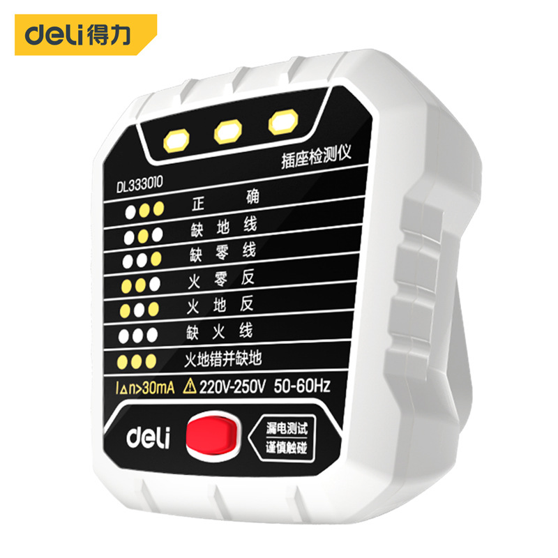 델리 공구 DL333010 소켓 라인 탐지기 그라운드 제로 화재 전원 코드 다기능 위상 누설 측정