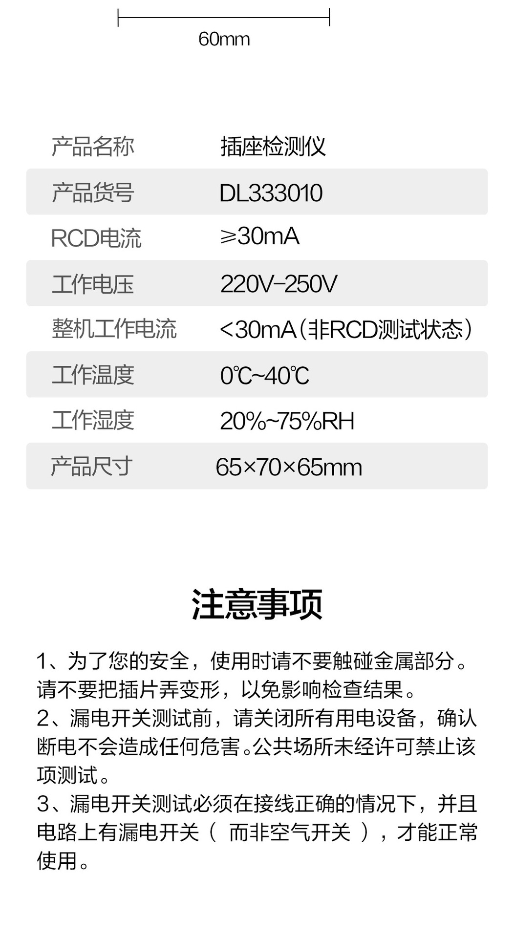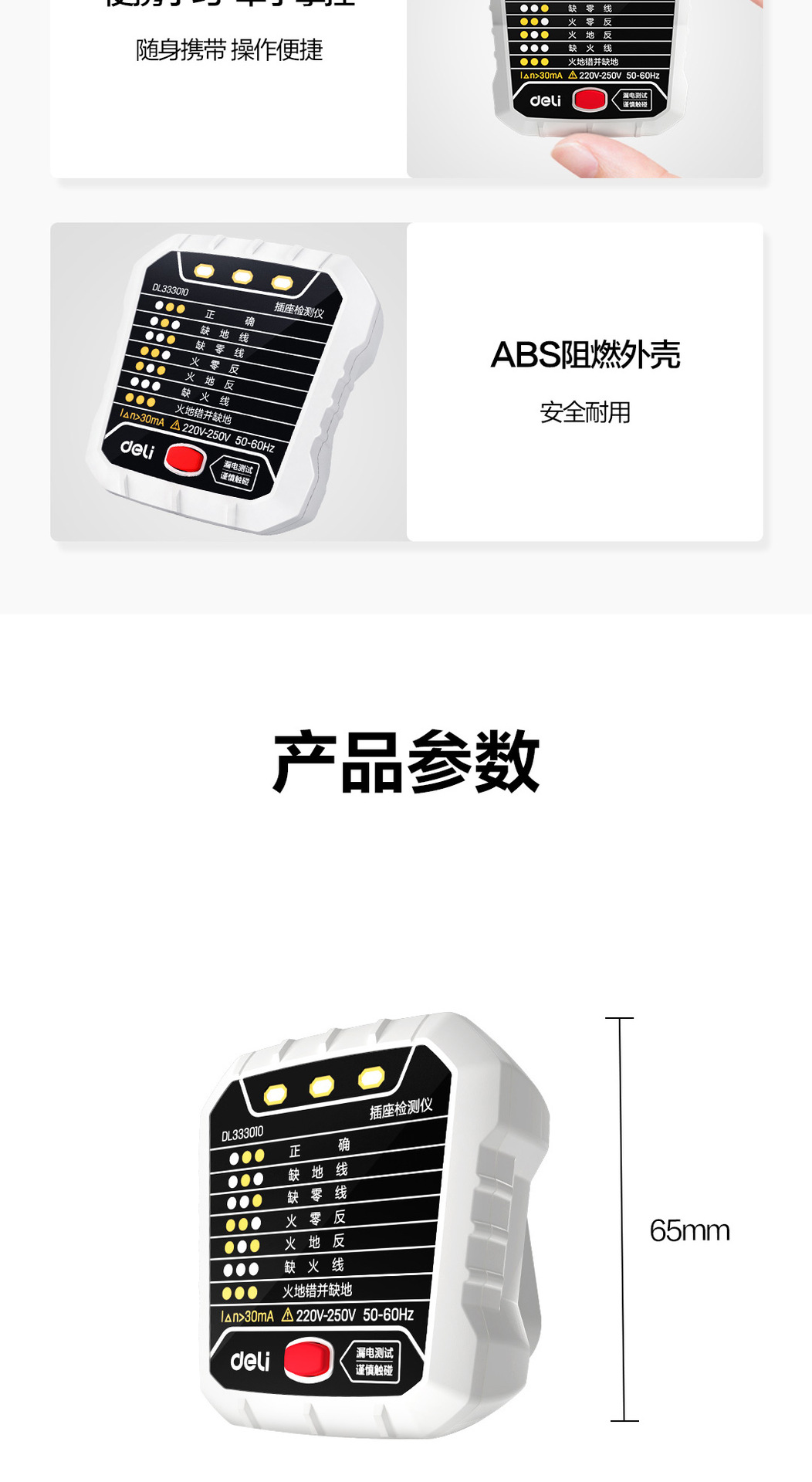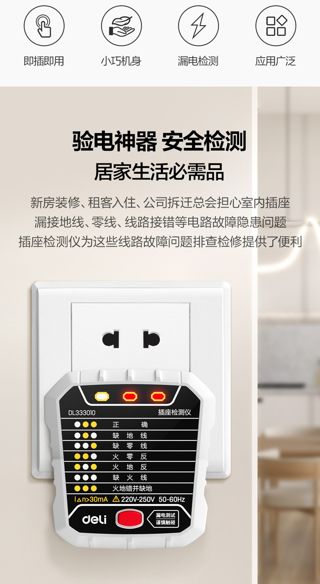 델리 공구 DL333010 소켓 라인 탐지기 그라운드 제로 화재 전원 코드 다기능 위상 누설 측정