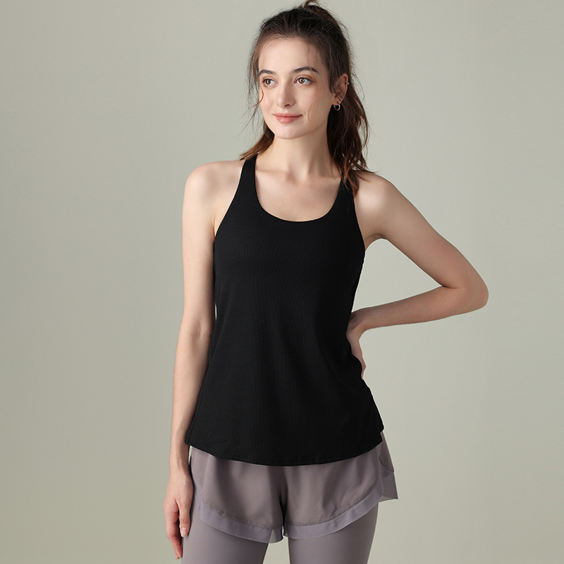 이중 레이어 디자인의 탄력 있는 피부 친화적인 요가 탑, 러닝 및 피트니스 요가 조끼, 가슴 패드 포함스토어 가기