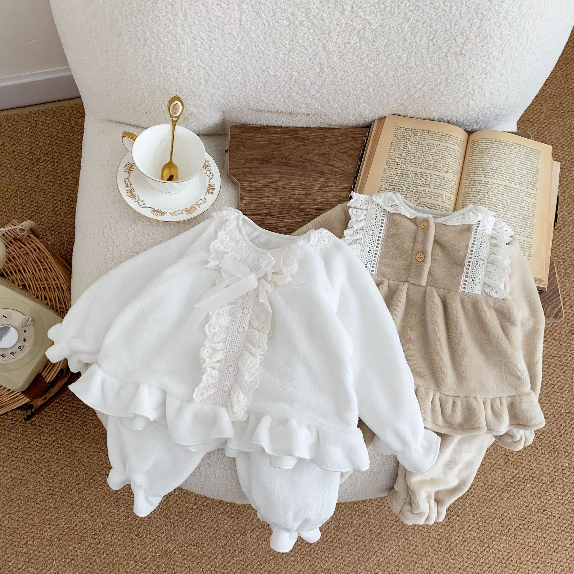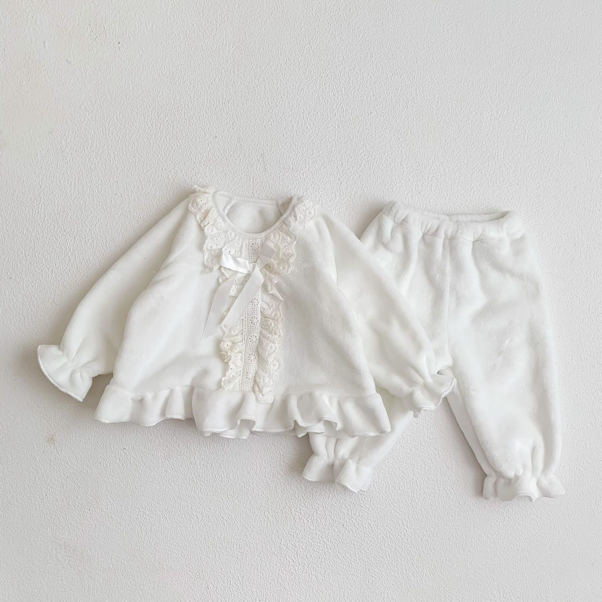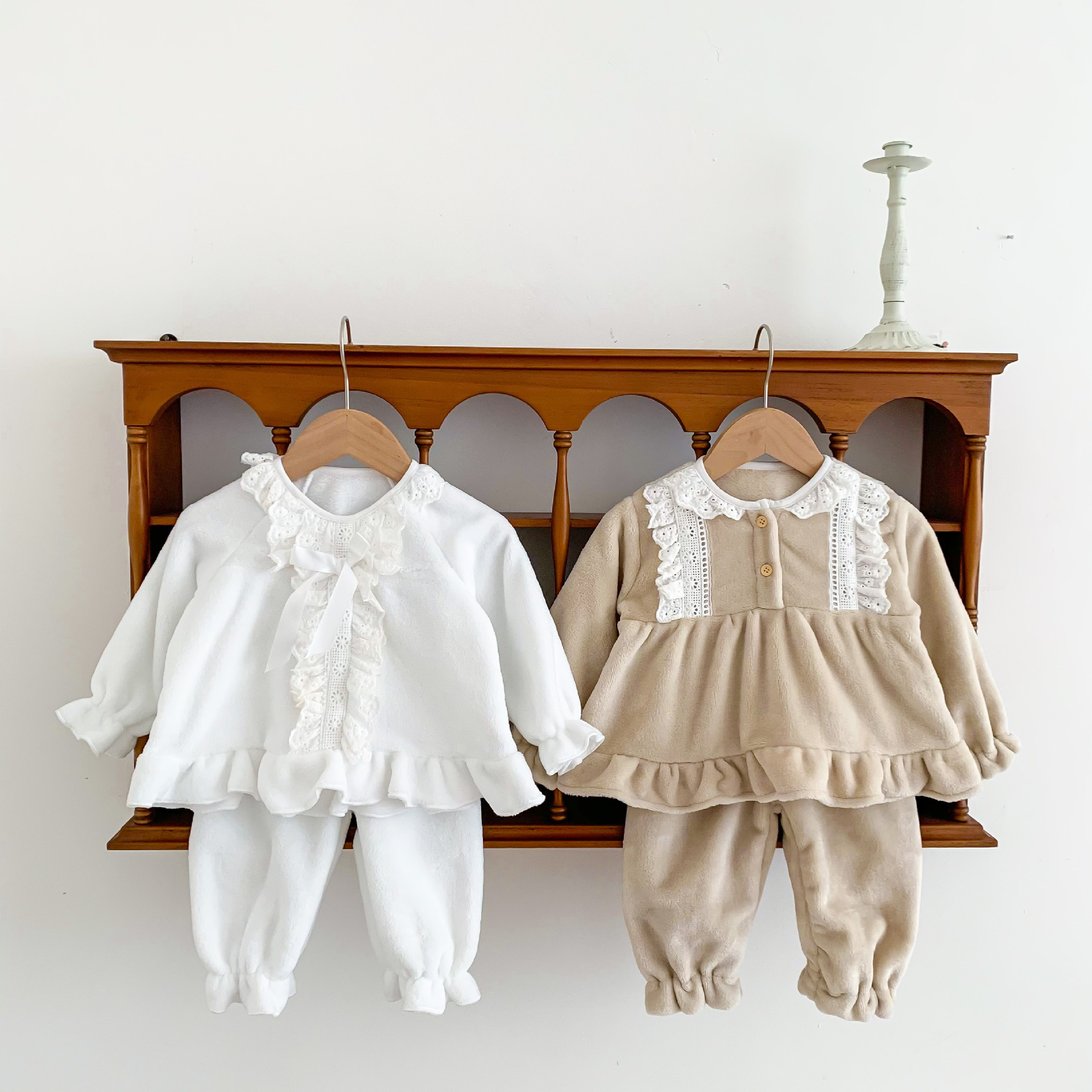 한국 가을 겨울 귀여운 레이스 플란넬 아기 소녀 잠옷 유아 공주 홈 2 피스 두께 착용