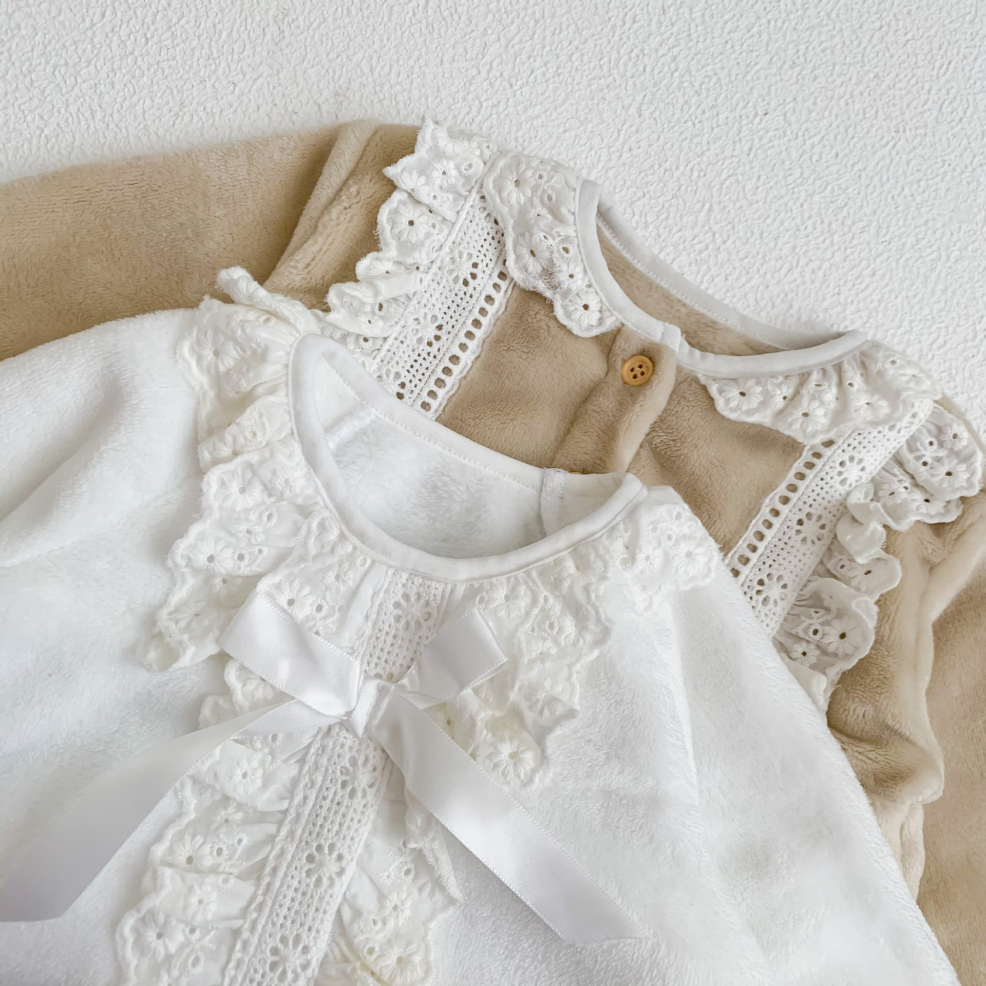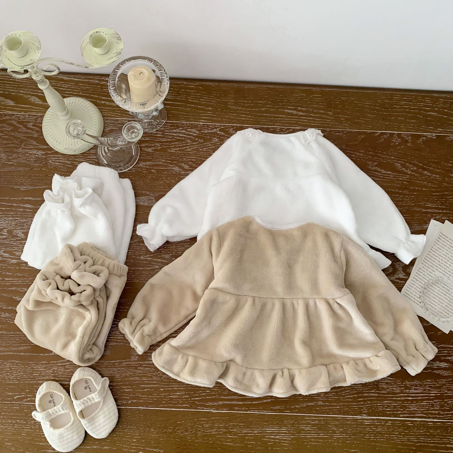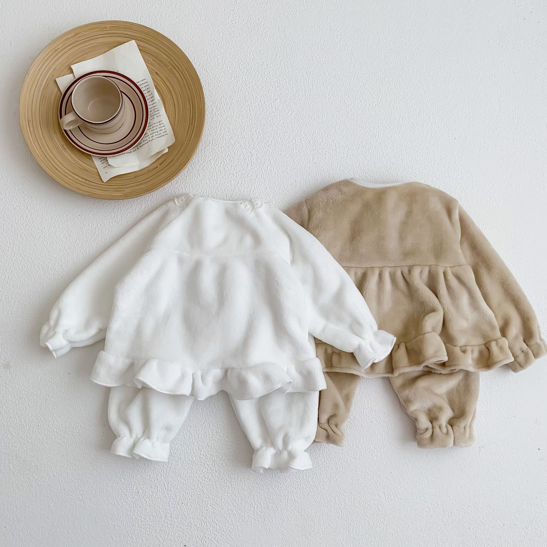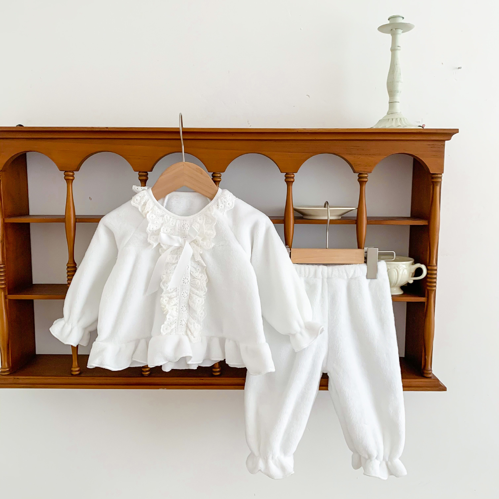한국 가을 겨울 귀여운 레이스 플란넬 아기 소녀 잠옷 유아 공주 홈 2 피스 두께 착용