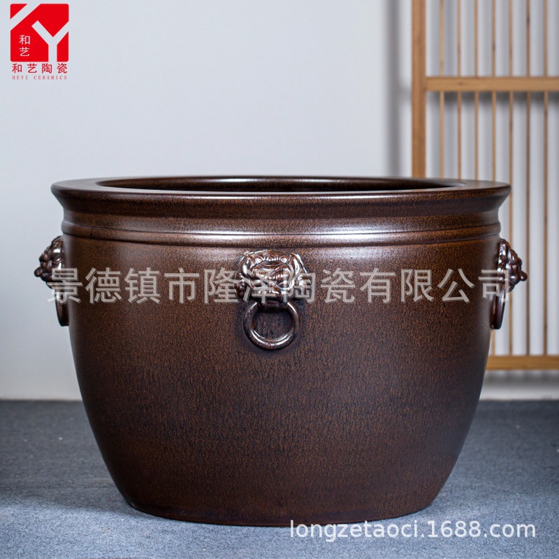 정경에 네 마리의 사자 머리가 있는 경덕진 골동품 도자기 대형 탱크, 풍수 탱크, 금붕어 탱크, 사원 및 사원 장식 대형 탱크