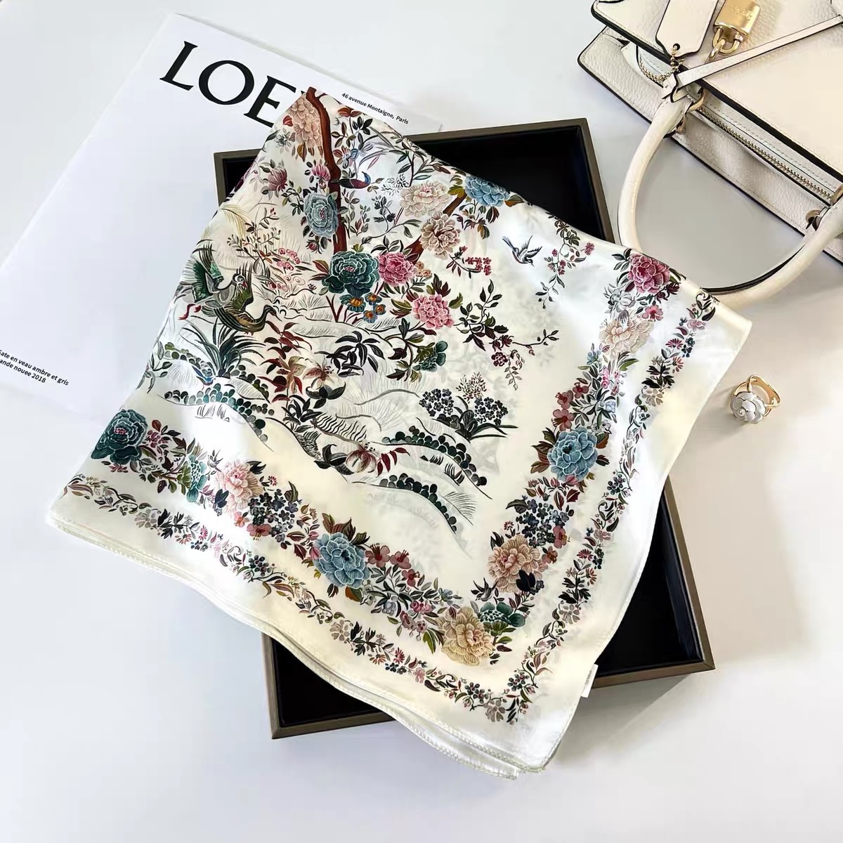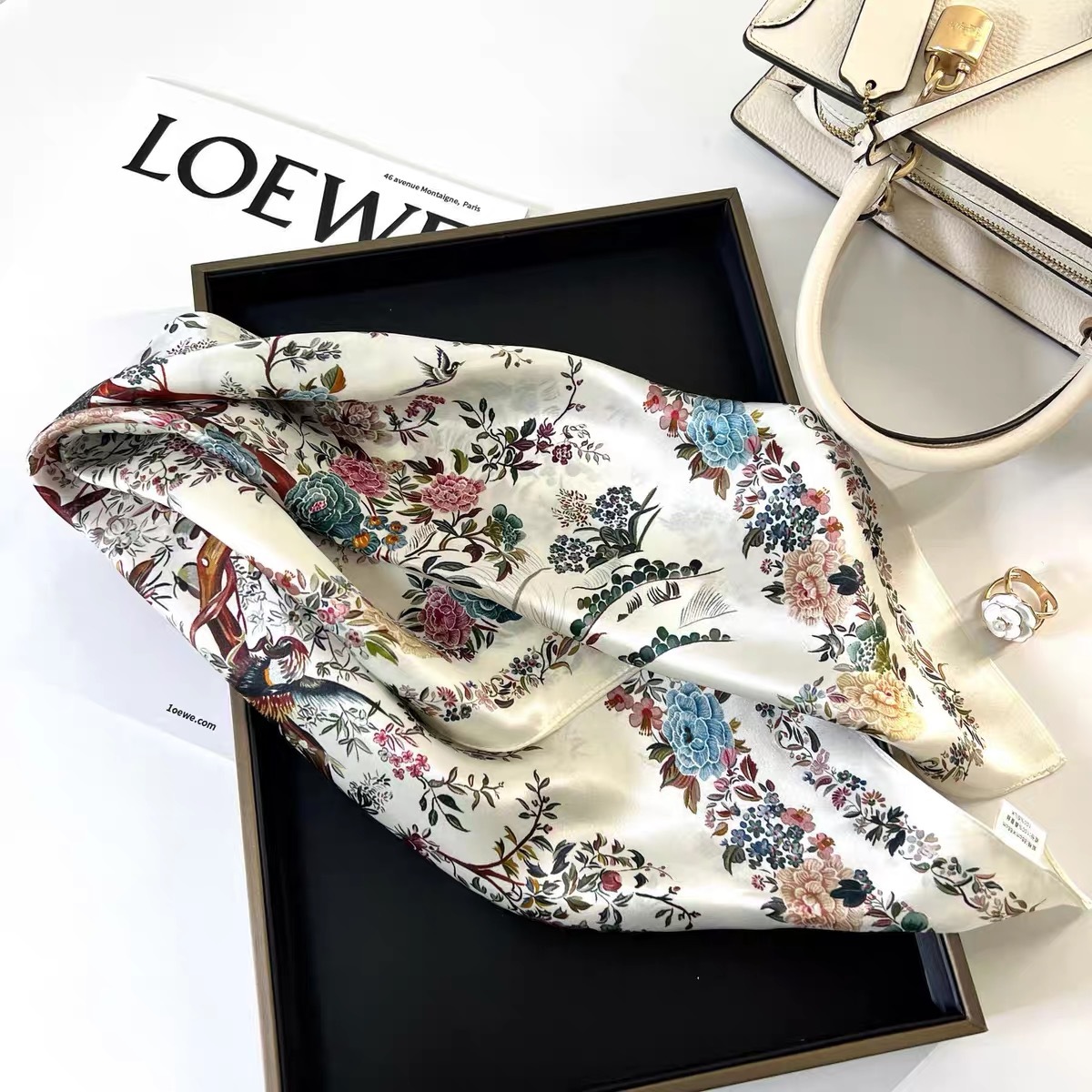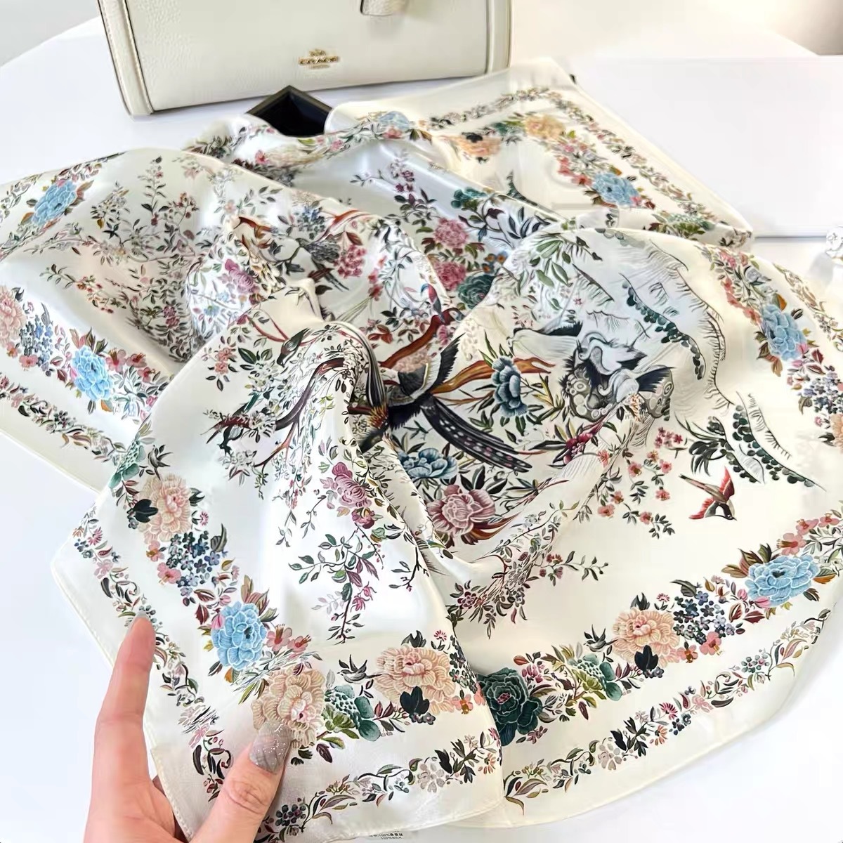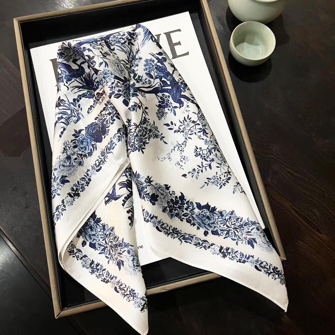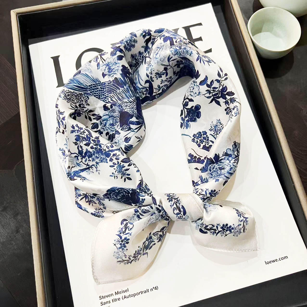 차갑고 치어없는 복고풍 파란색과 흰색 도자기 파란색 장식 실크 스카프 셔츠 선물이있는 여성용 다목적 뽕나무 실크 작은 스카프