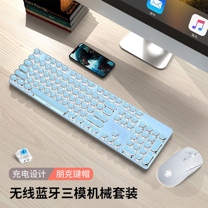 • 블루 [화이트 연두색 축] 무선 유선 블루투스 3 모드 펑크 버전 + 무선 마우스