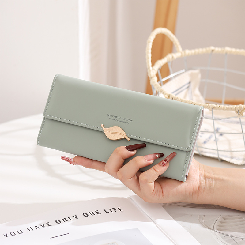 국경 간 대외 무역 지갑 여성용 긴 일본과 한국식 PU 가죽 신선한 잎 버클 심플 올 매치 여성용 클러치 카드 백