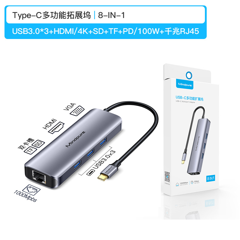 • 8-in-1 USB3.0 * 3 + HDMI + PD + SD + TF + 기가비트 RJ45 HU010