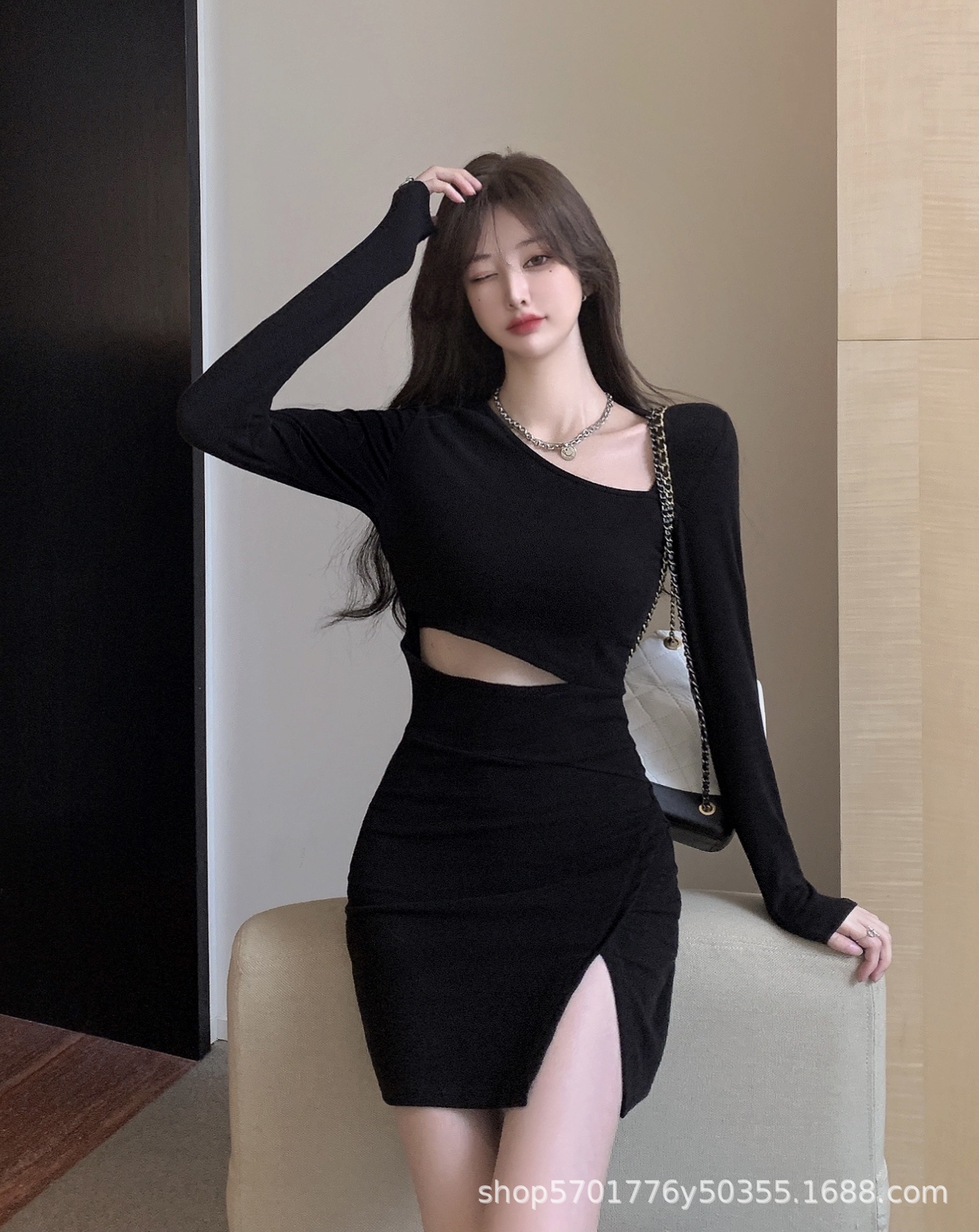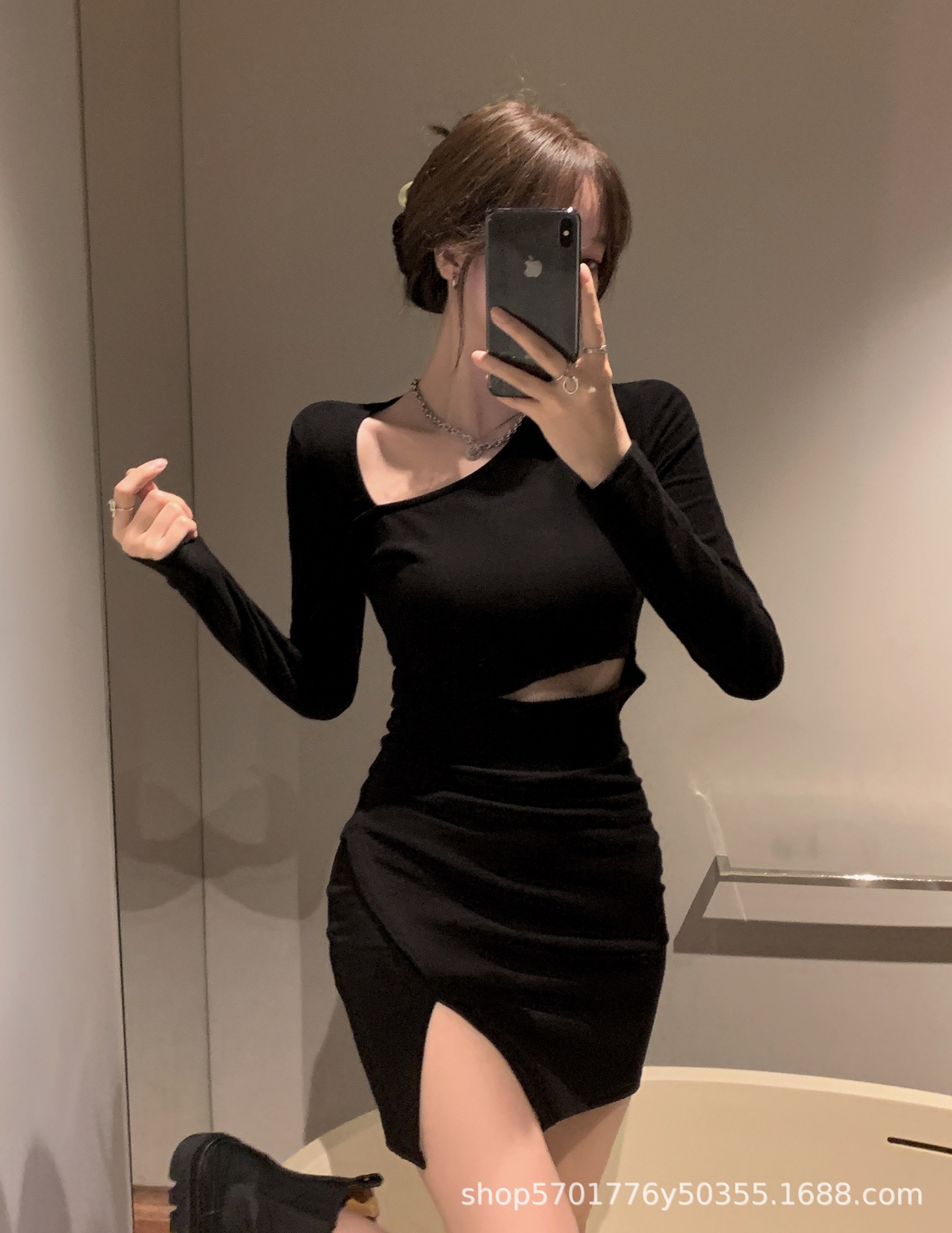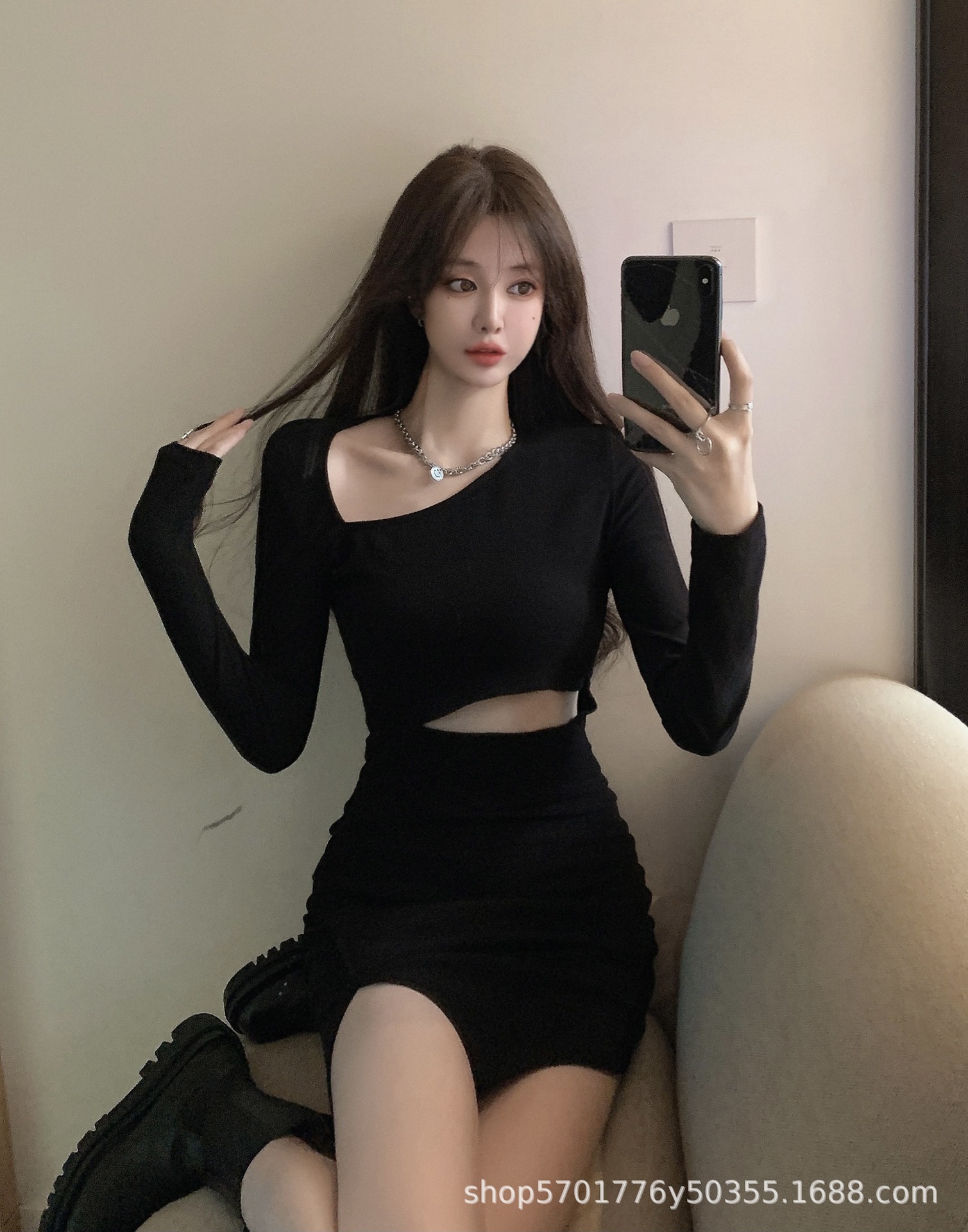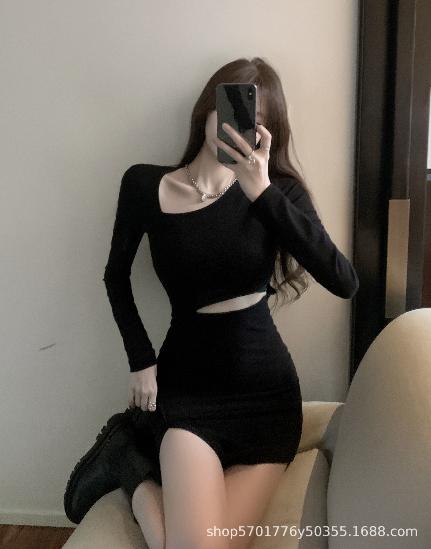 가을 2022 새로운 짧은 치마 검은 엉덩이 치마 디자인 감각 주의 기계 뜨거운 소녀 긴 소매 원피스 여성 의류스토어 가기
