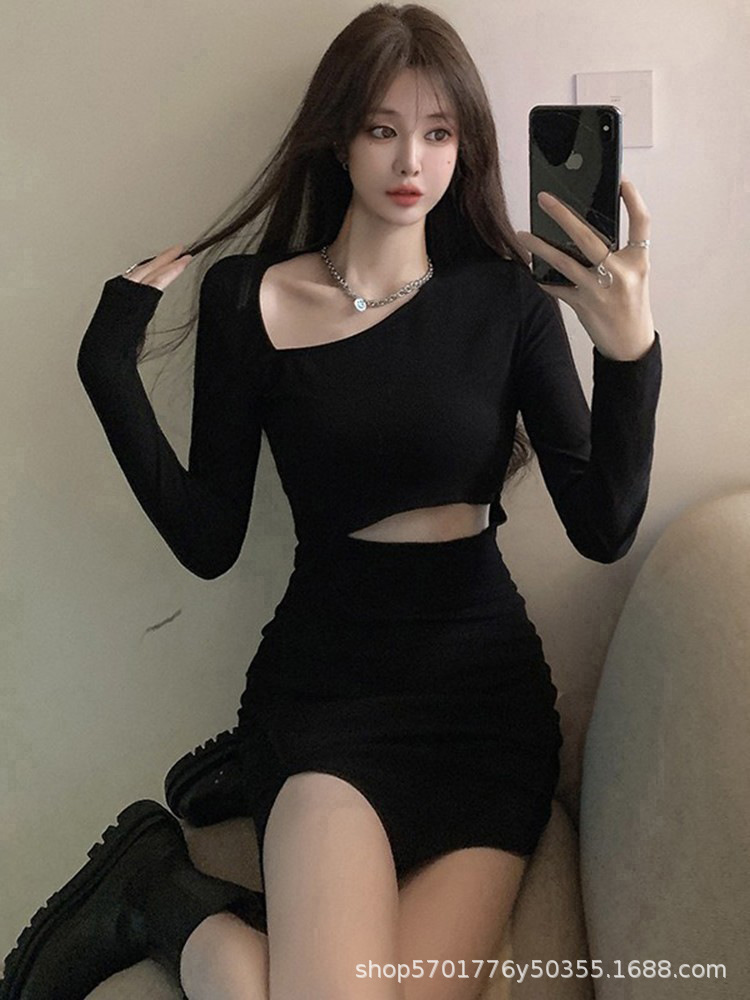 가을 2022 새로운 짧은 치마 검은 엉덩이 치마 디자인 감각 주의 기계 뜨거운 소녀 긴 소매 원피스 여성 의류