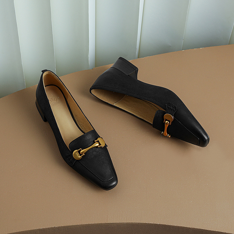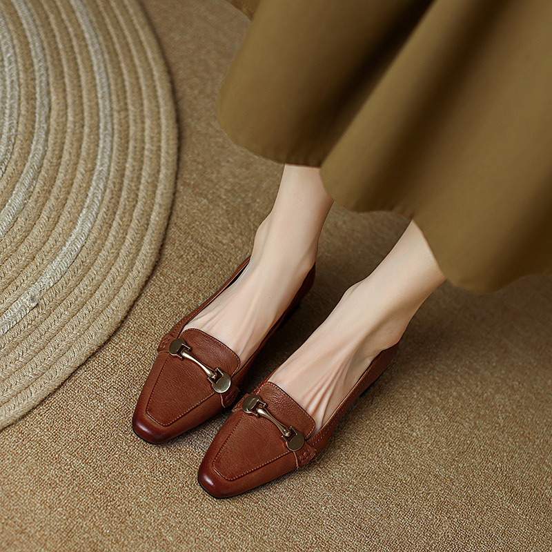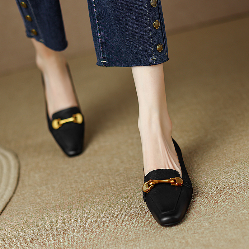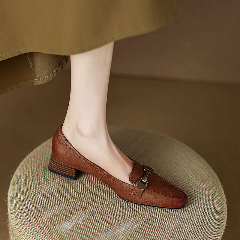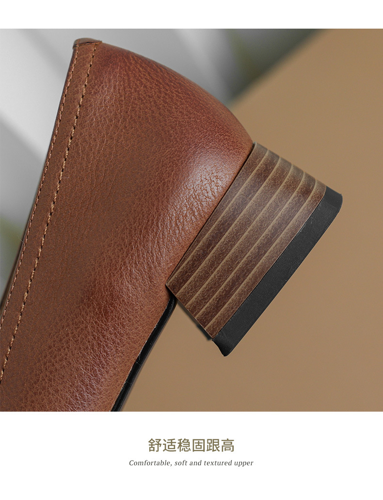 复古小方头英伦风小皮鞋女春秋季新款真皮百搭粗中低跟浅口单鞋子