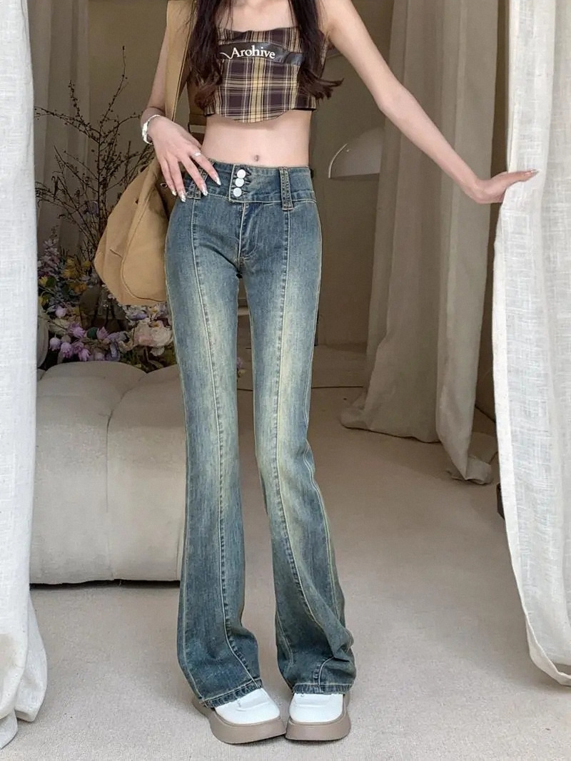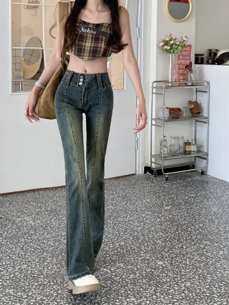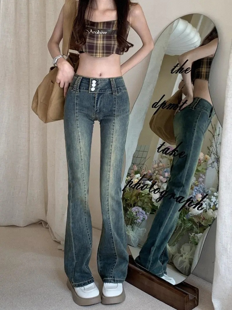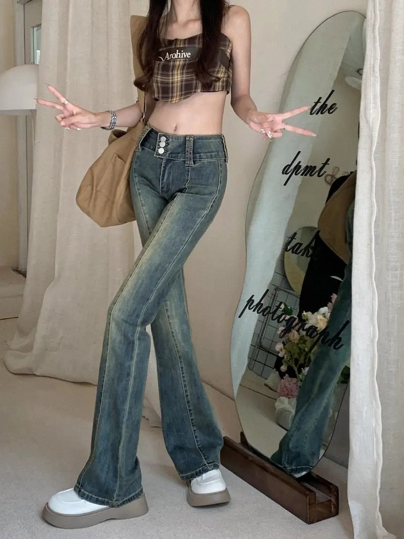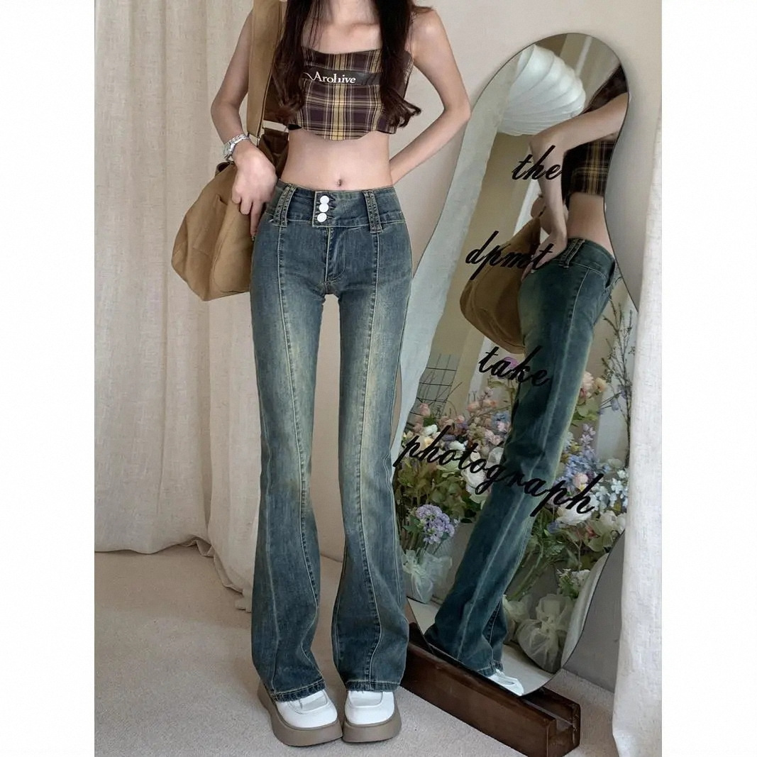 미국 핫 걸 복고풍 스트레치 청바지 여성의 가을 새로운 스트레이트 슬림 걸레 마이크로 혼 바지 유행 바지스토어 가기