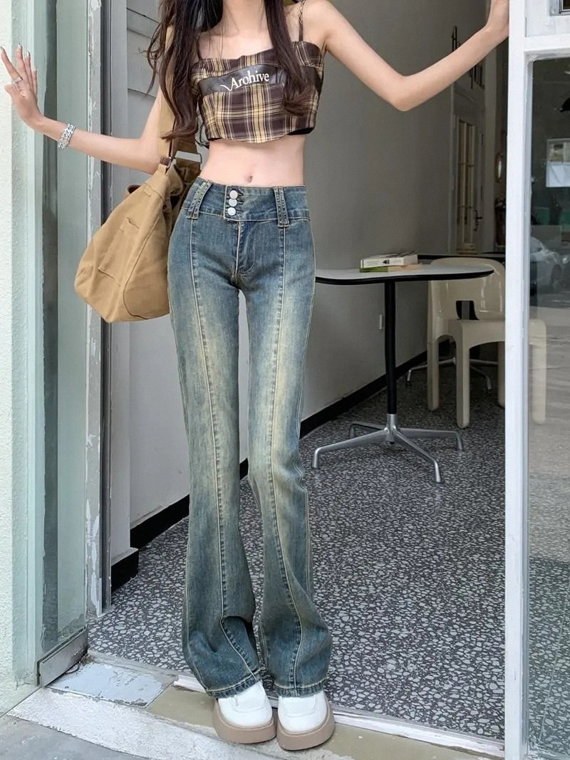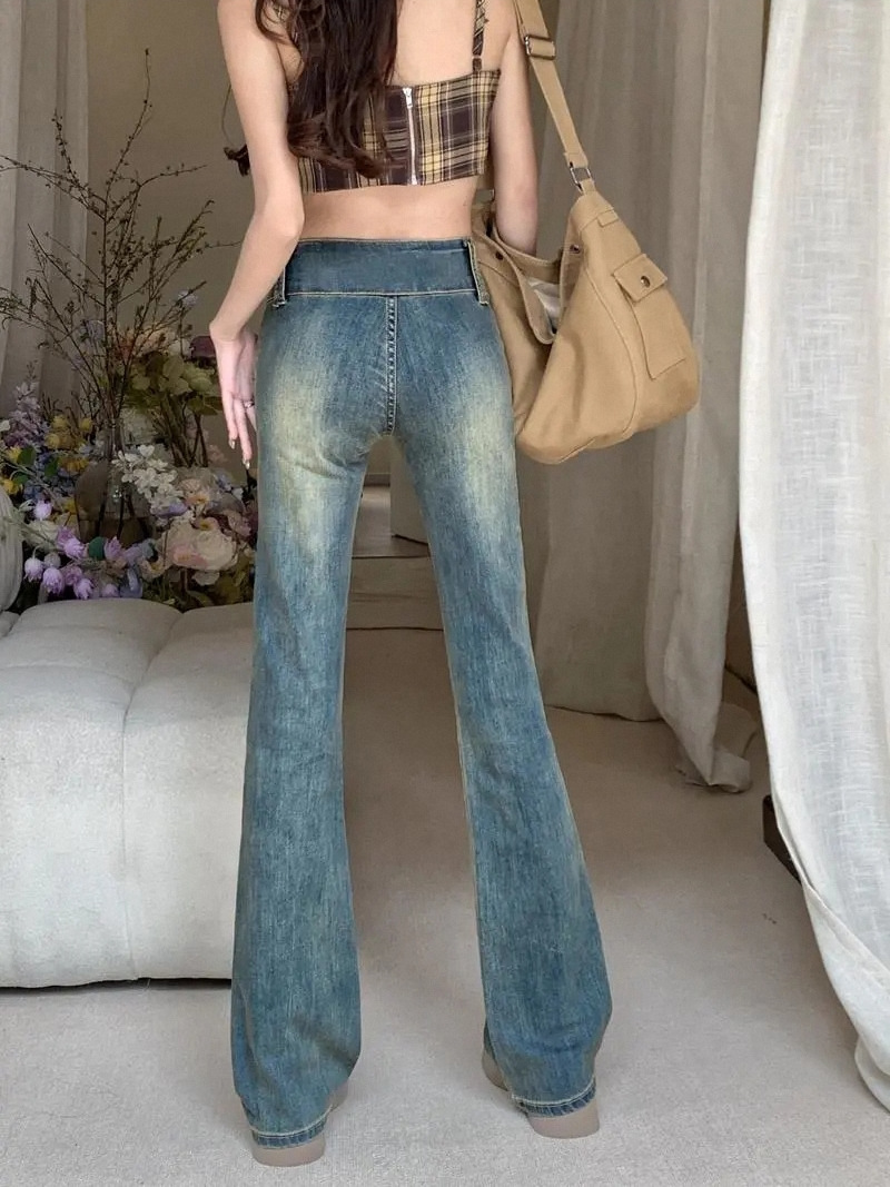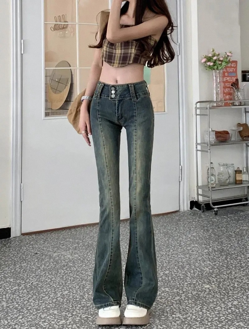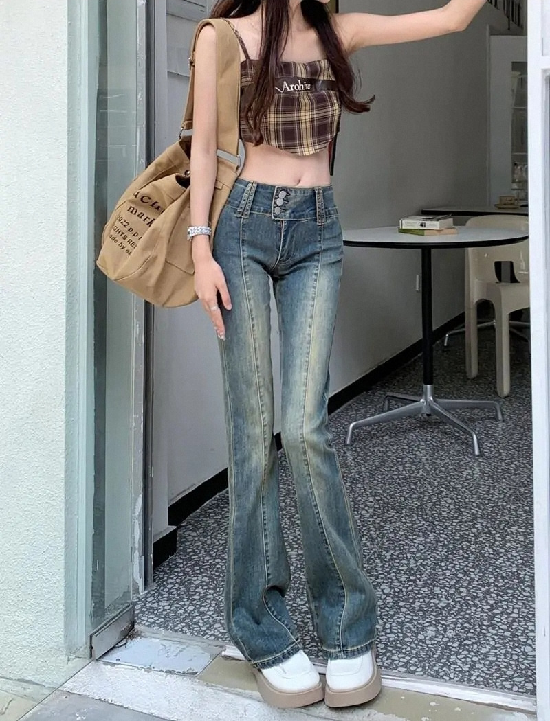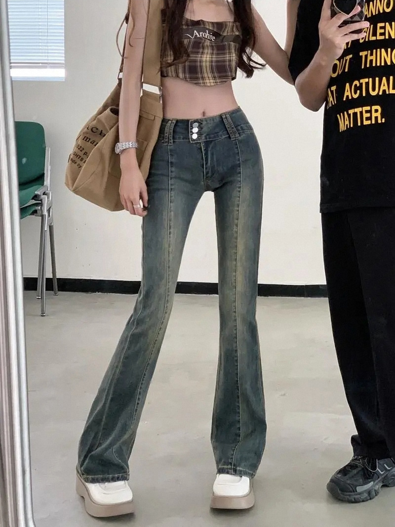 미국 핫 걸 복고풍 스트레치 청바지 여성의 가을 새로운 스트레이트 슬림 걸레 마이크로 혼 바지 유행 바지스토어 가기