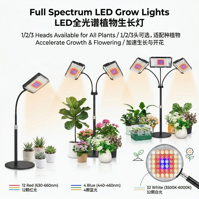 全光谱 - 紧凑型生长灯, LED ,全光谱 390nm-730nm,包括白色(3500K&6500K)红色和蓝色。 植物可以从这种生长灯中获得他们想要的光谱。 它适合所有生长阶段,如幼苗、发芽、植物开花。