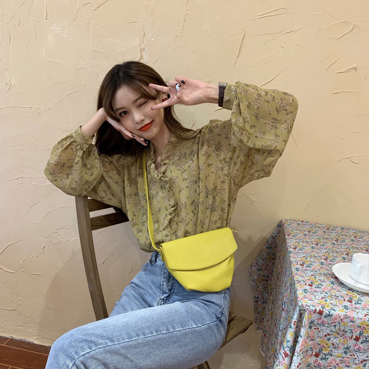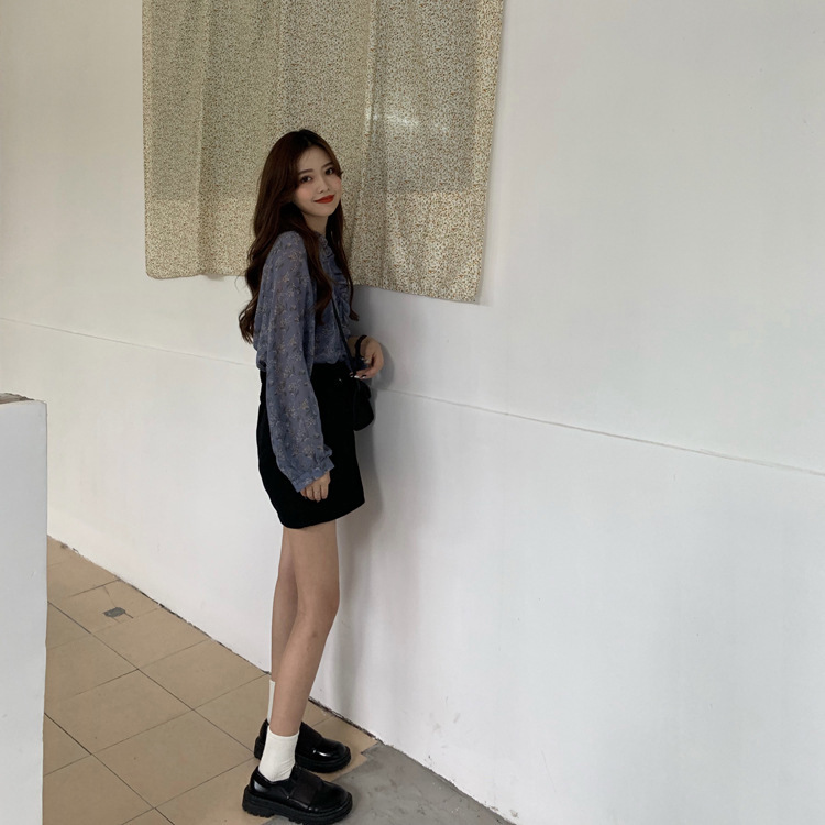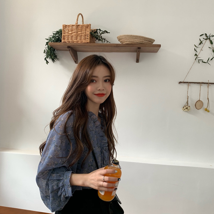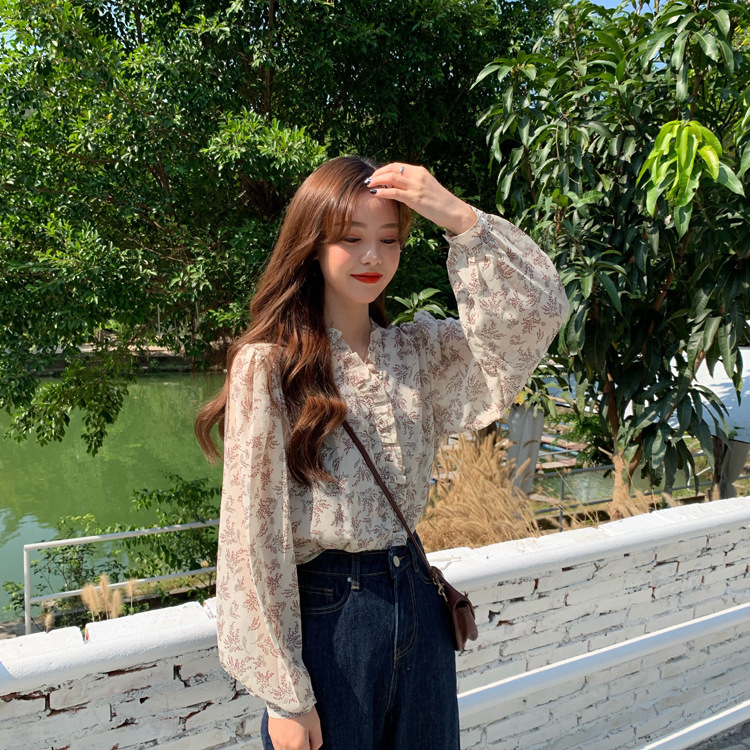 2022 새로운 스타일 작은 셔츠 한국 스타일 부드러운 스타일 꽃 쉬폰 셔츠 여성용 긴 소매 베이스 셔츠 퍼프 슬리브 탑스토어 가기