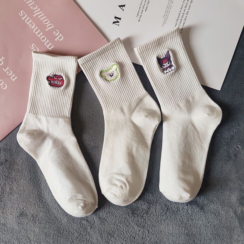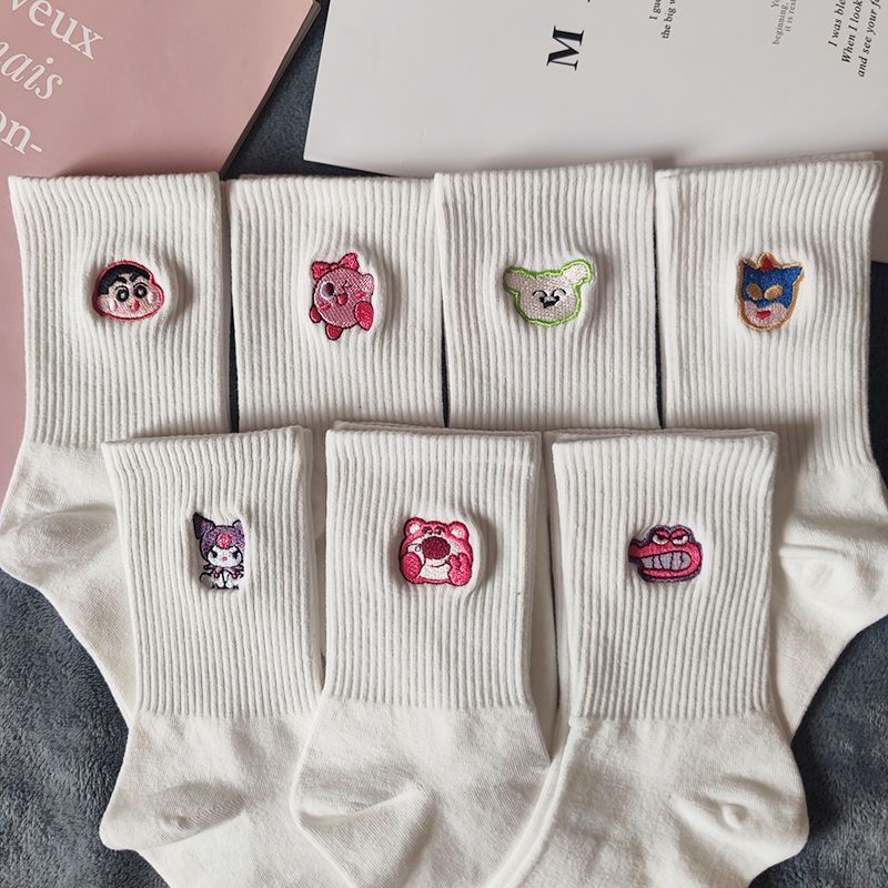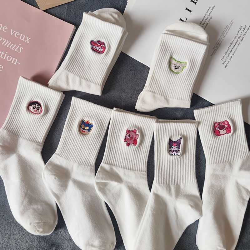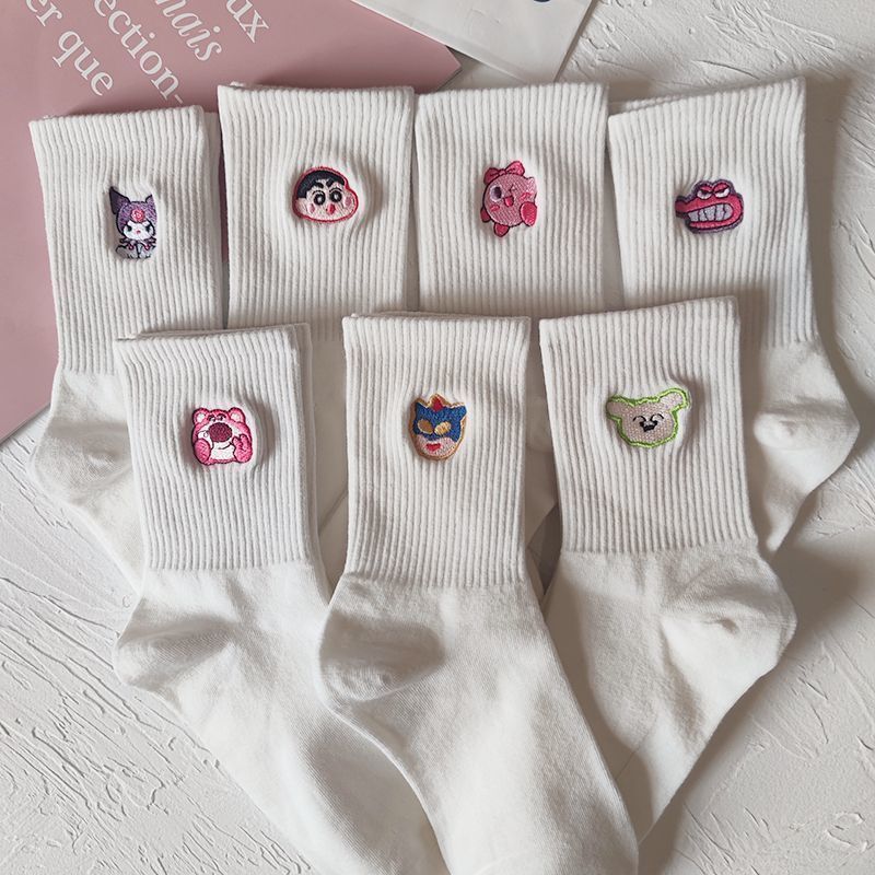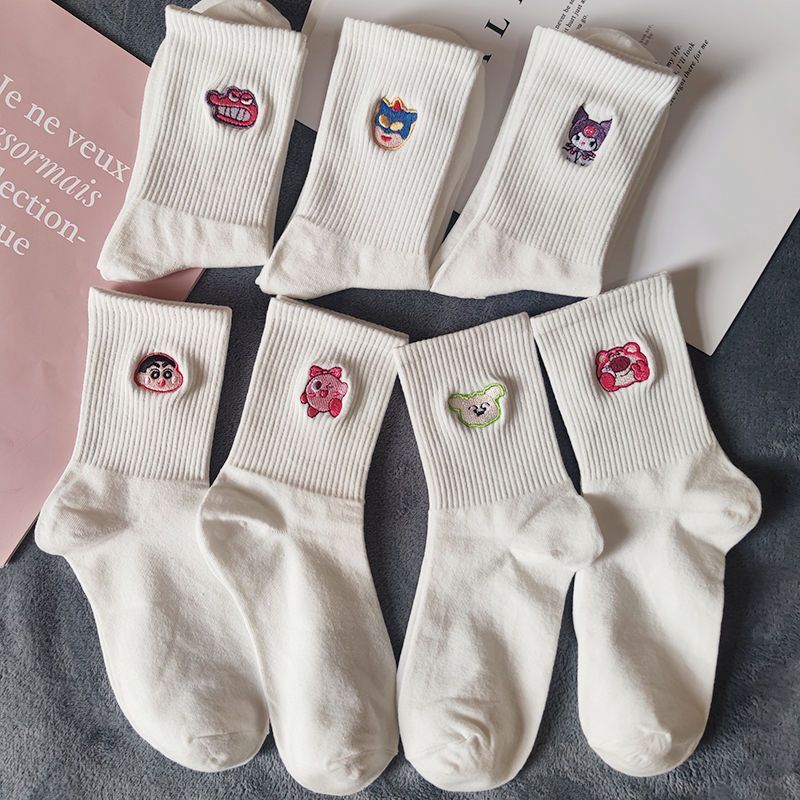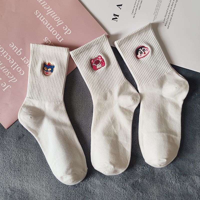 일본식 면 양말 여성용 미디엄 사이즈 인 트렌디 올 매치 자수 커플 화이트 양말 스포츠 양말 귀여운 양말