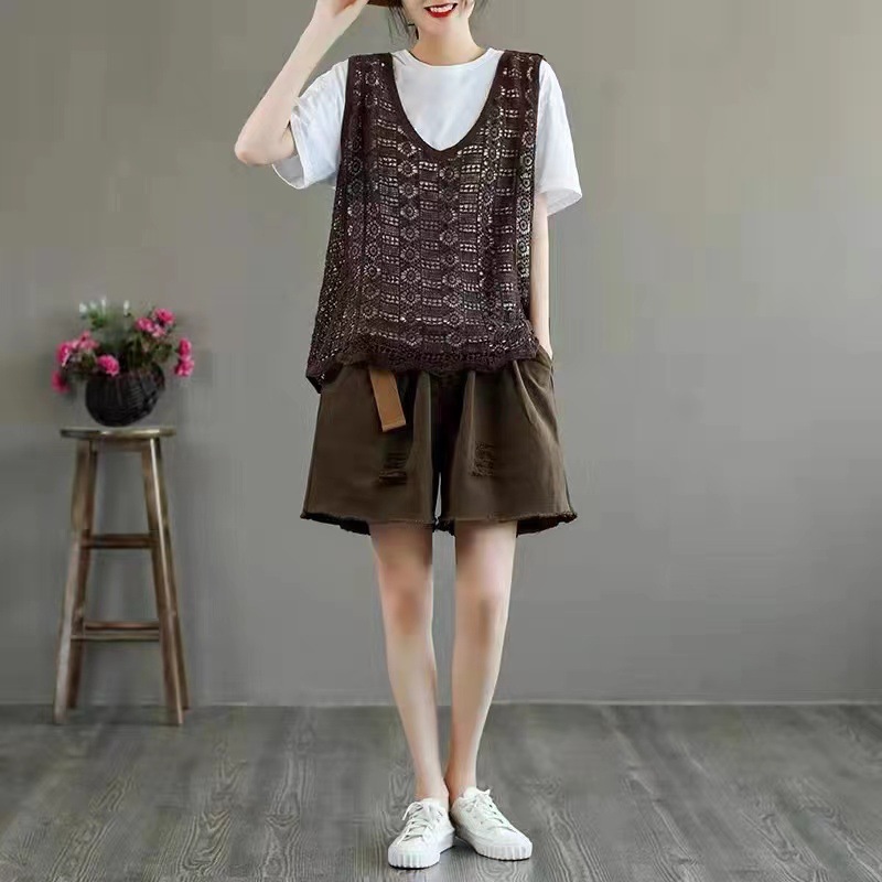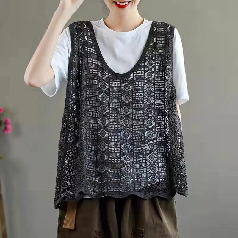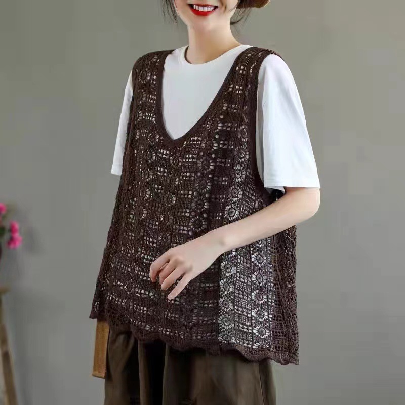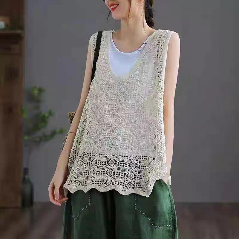코튼 크로 셰 V-넥 중공 니트 조끼 여성의 여름 얇은 빈티지 예술적 느슨한 통기성 모든 일치 조끼 유행스토어 가기