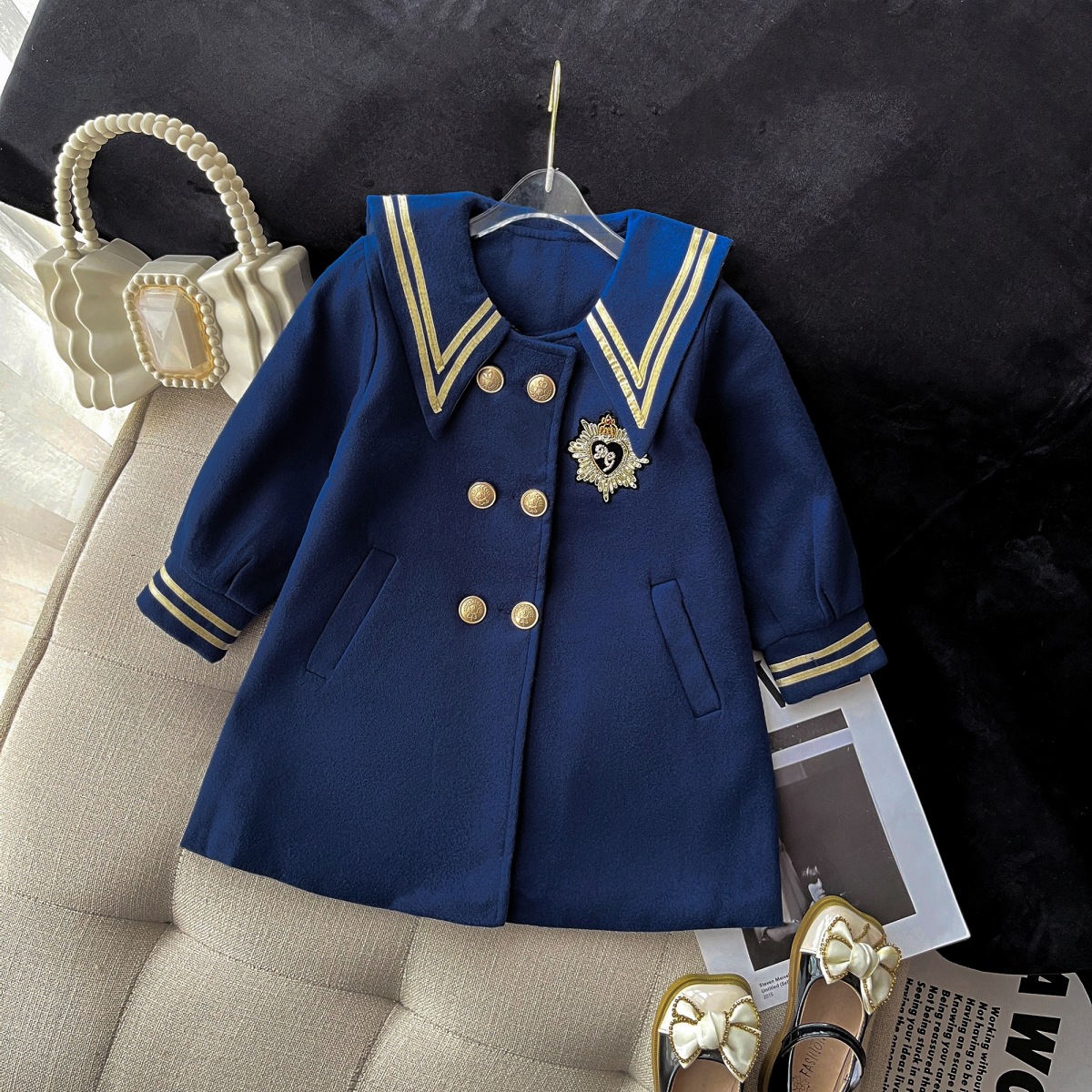 77122 소녀의 모직 코트 중간 길이 대학 스타일 2023 가을과 겨울 해군 스타일 코트 작은 소녀의 코트