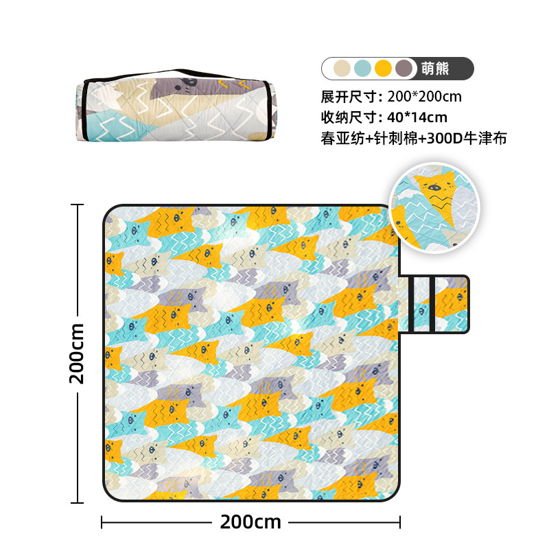 视频里面的是底部210D牛津布款式,300D牛津布防水(颜色蓝色)底部是老款,表面是没有防泼水的。作为野餐垫底部的防水层,牛津布抗撕裂,防水防潮,可机洗,柔韧性强,不会像PEVA在超声波绗缝中容易被打出洞,从而影响防水和品质,并且牛津布底可以适应大多数地形场景,我司中间的填充针刺棉是80gsm,市面上常规的是60gsm,更厚更舒适,接下来我司会陆续推出时下时尚的款式,尺寸也会把2*3米和3*3米的加进来,后期更会推出防水很好的铝膜底的超声波野餐垫,具有更好的防水能力,可以隔绝冷热,铺在帐篷里面露营非常合适,耐撕裂,厚度更厚(克重达到110gsm左右,市面上PEVA 75gsm),耐磨性更强,如对我们后期推出的新品感兴趣,欢迎咨询选购。