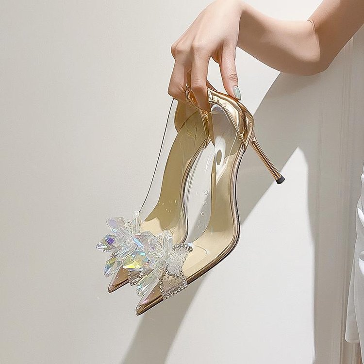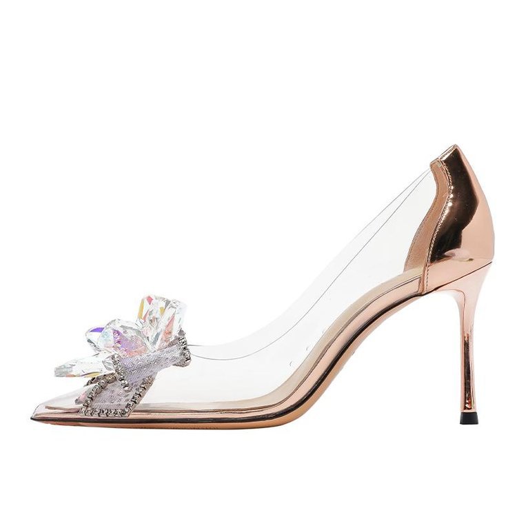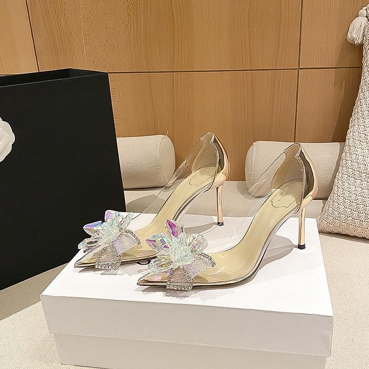 라인스톤 리본 포인티드 토 레이디스 스타일 하이힐 여성용 2025 여름 투명 샴페인 컬러 싱글 슈즈스토어 가기