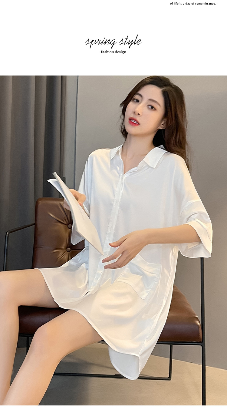 남자 친구 스타일 잠옷 봄과 여름 신상품 잠옷 여성용 아웃웨어 실크 같은 섹시한 얇은 셔츠 느슨한 홈 원피스