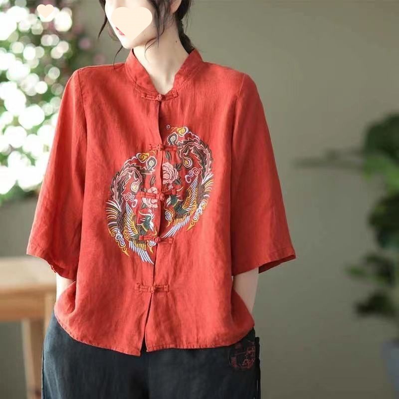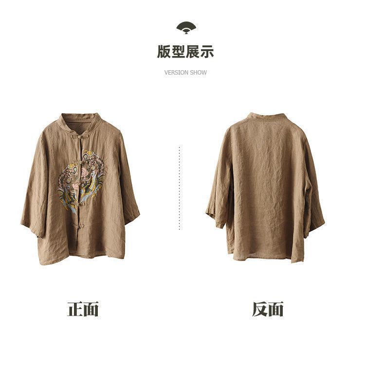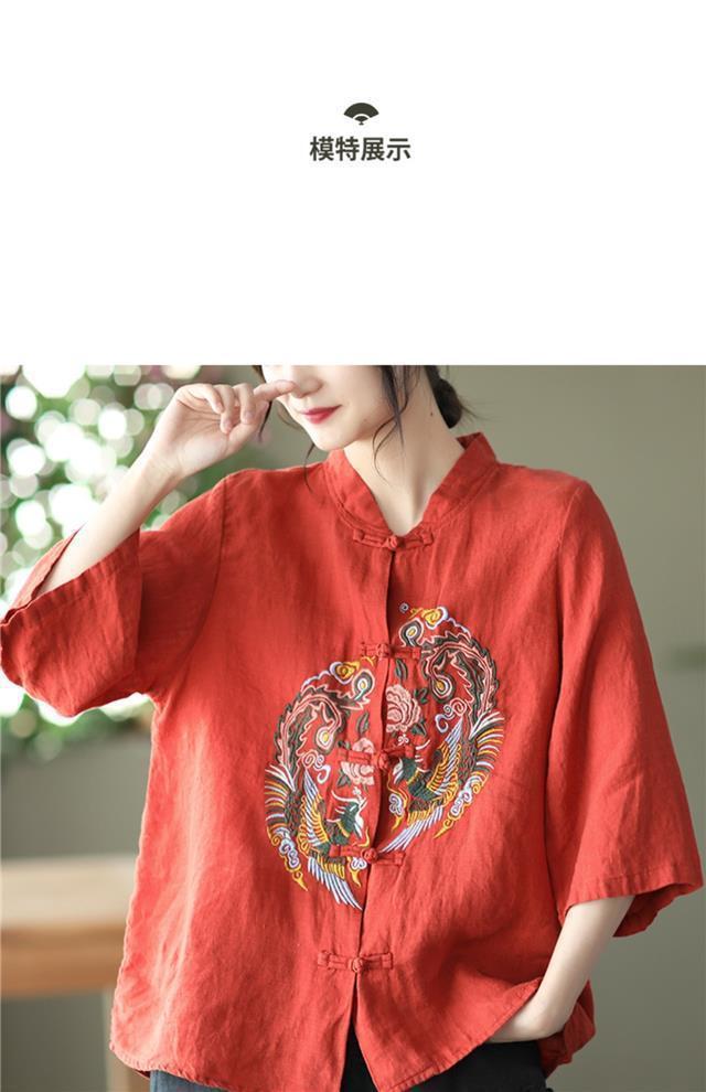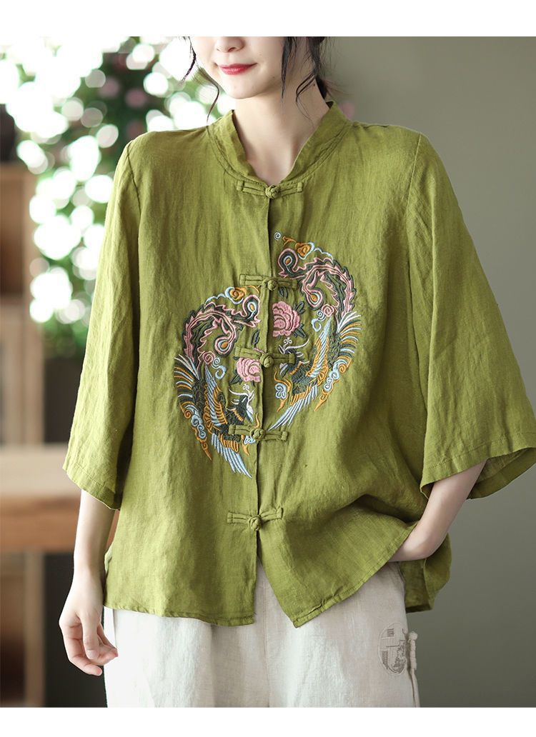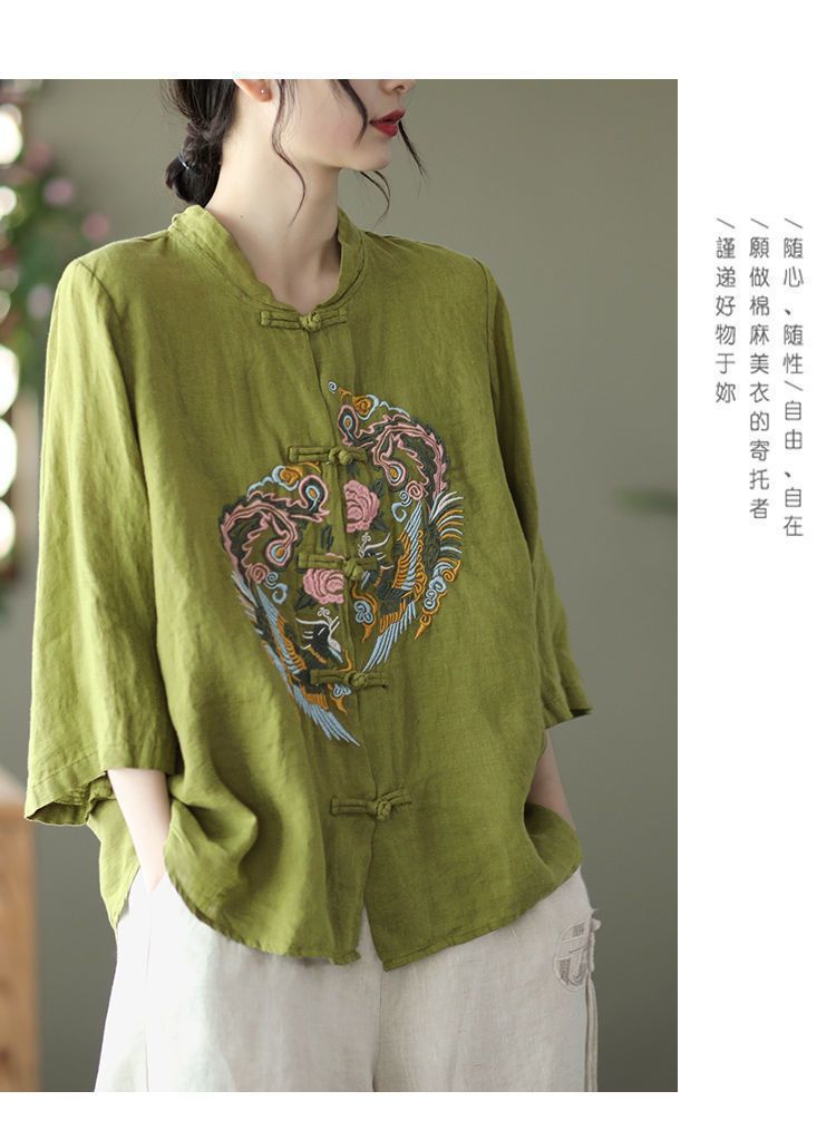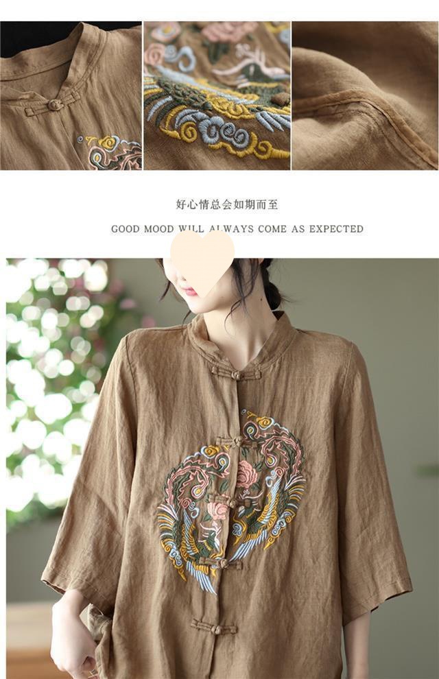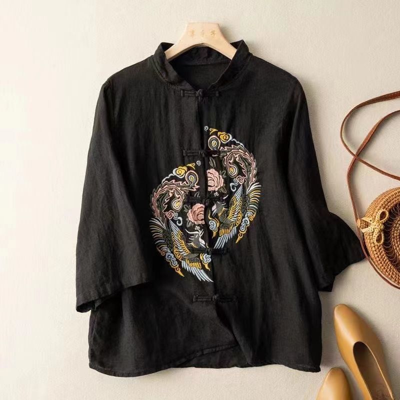 빈티지 에스닉 스타일 중공업 자수 면과 린넨 탑 여성의 예술적 버클 스탠드 칼라 느슨한 플러스 사이즈 셔츠 우아한 셔츠스토어 가기