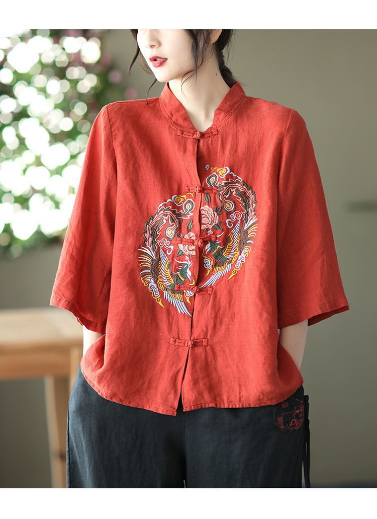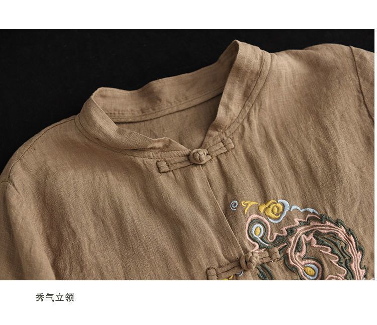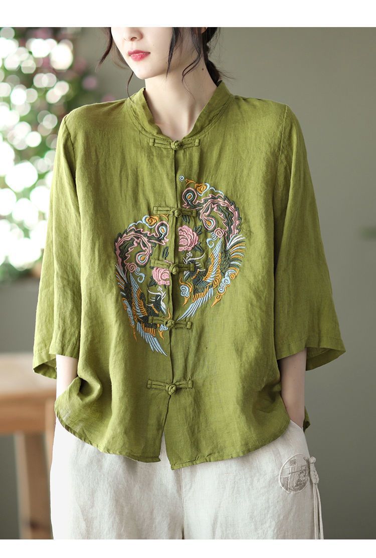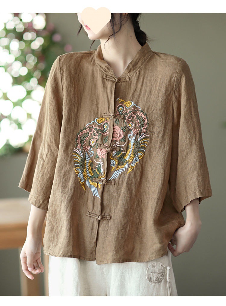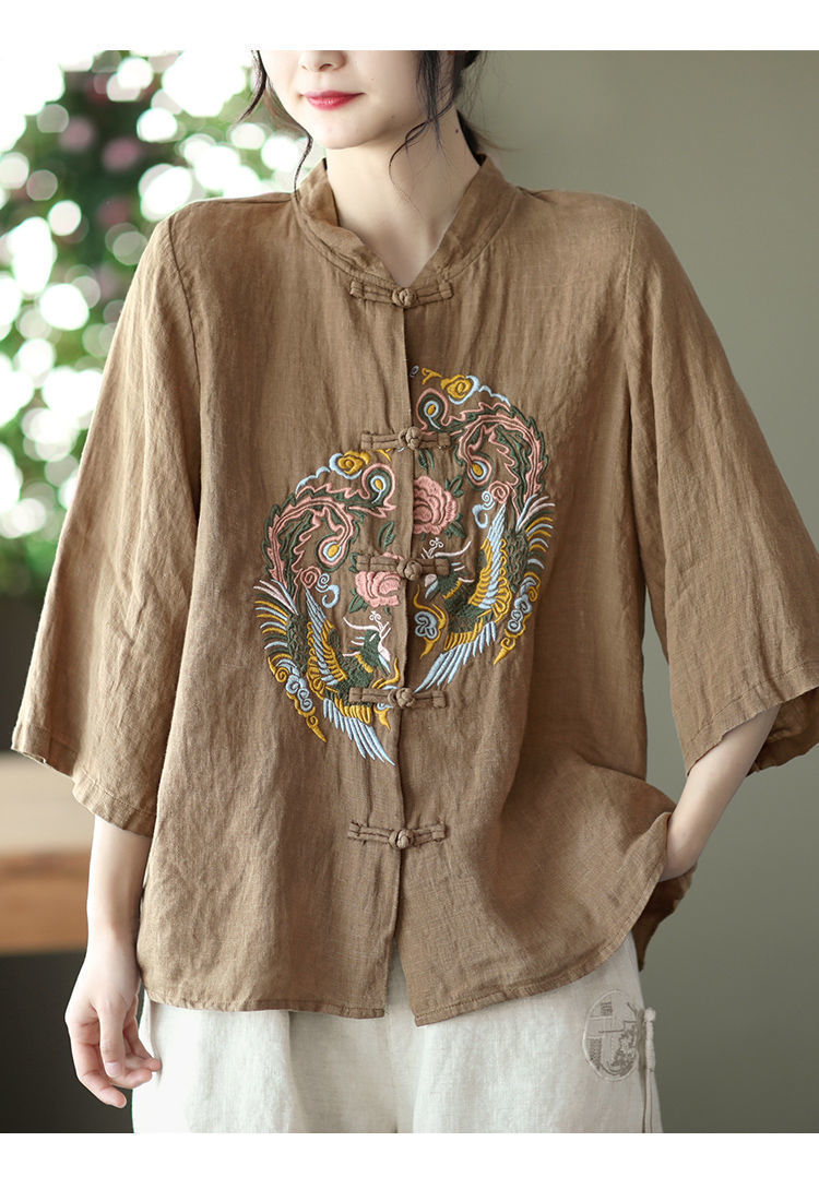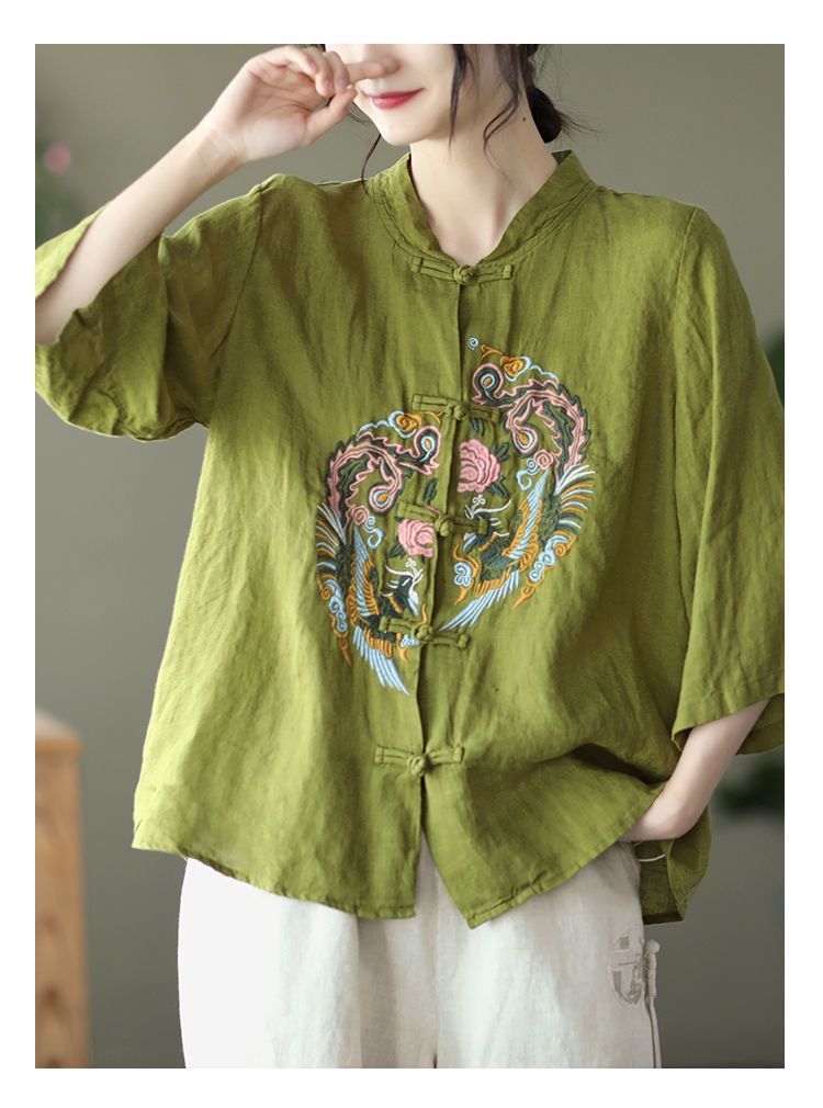 빈티지 에스닉 스타일 중공업 자수 면과 린넨 탑 여성의 예술적 버클 스탠드 칼라 느슨한 플러스 사이즈 셔츠 우아한 셔츠스토어 가기